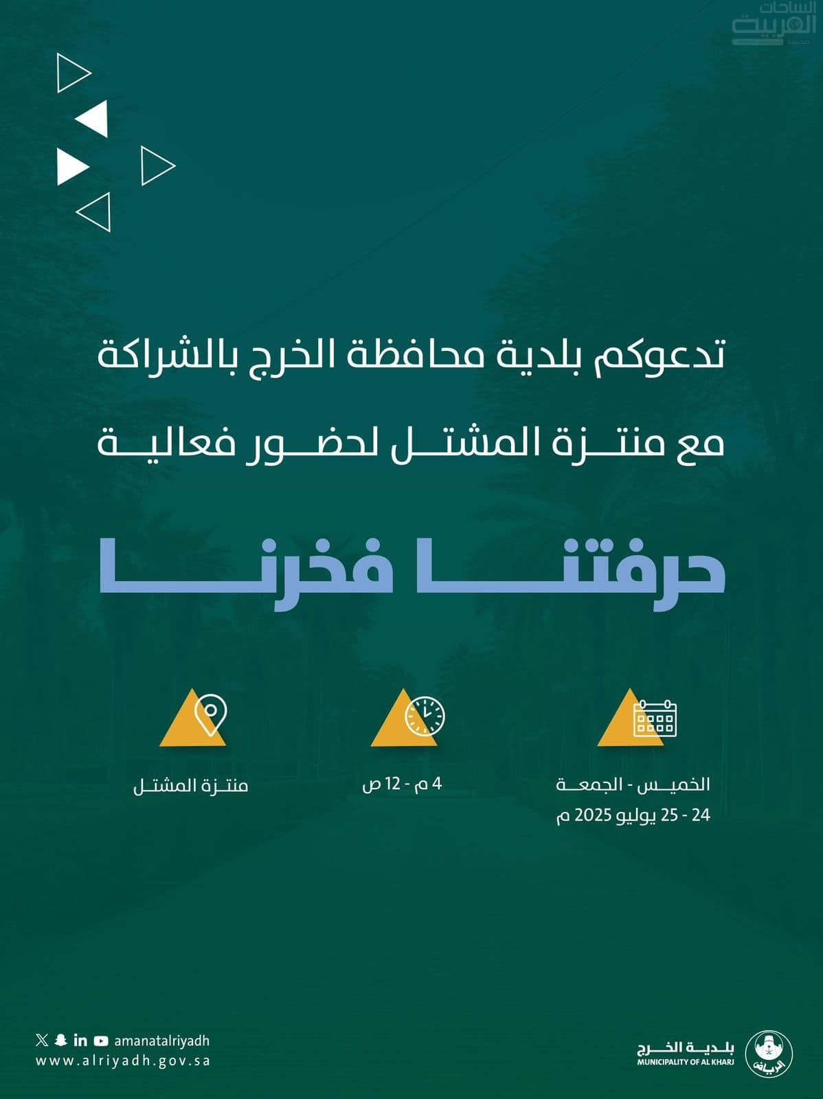 اختتمت في مشتل الخرج فعاليات “حرفتنا فخرنا” التي أقيمت يومي الخميس والجمعة الموافق 24 – 25 يوليو 2025، بموافقة كريمة من صاحب السمو الملكي الأمير فهد بن محمد بن سعد بن عبدالعزيز محافظ الخرج، برعاية بلدية الخرج وغرفة الخرج وشركة المراعي وشركة الوفاء هايبر ومجوهرات الشريف وذلك ضمن برامج الاحتفاء بعام الحرف 2025، بهدف إبراز التراث الوطني ودعم الحرفيين السعوديين.