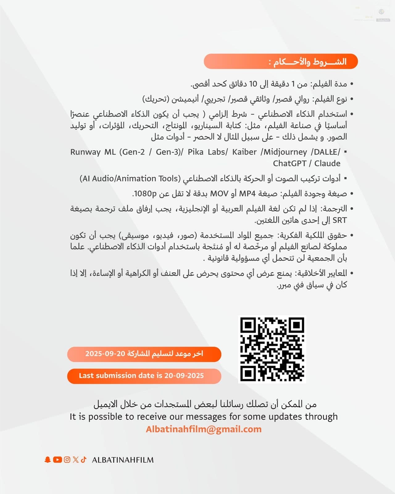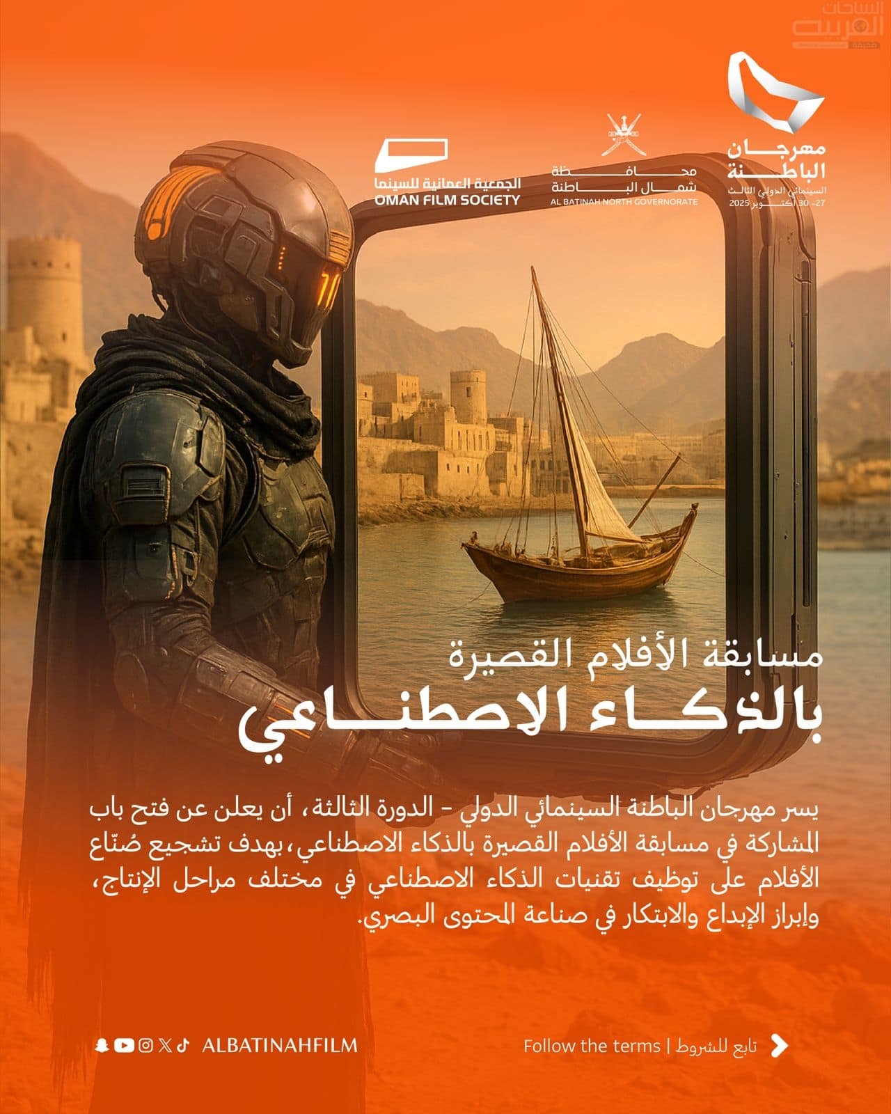 أعلنت الجمعية العُمانية للسينما عن إطلاق مسابقة الأفلام القصيرة بالذكاء الاصطناعي، التي تُقام لأول مرة ضمن فعاليات مهرجان الباطنة السينمائي الدولي – الدورة الثالثة، المقرر انعقاده خلال الفترة من 27 إلى 30 أكتوبر 2025، بمشاركة نخبة من صنّاع الأفلام المحليين والدوليين.