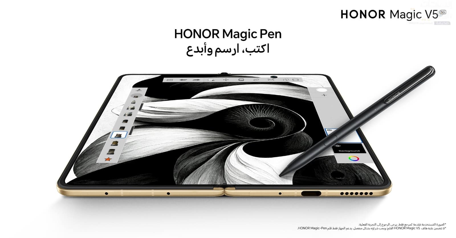 بالإضافة إلى ذلك، يدعم HONOR Magic V5 قلم HONOR Magic-Pen على كل من الشاشة الداخلية والخارجية، مما يتيح الكتابة والرسم والتعليق بسلاسة، ويُعزز بشكل كبير من الدقة، خاصة في مهام تحرير النصوص.