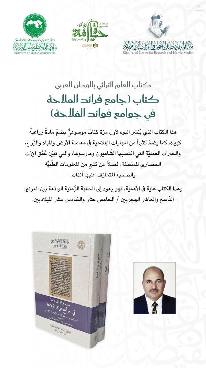 اختير كتاب “جامع فرائد الملاحة في جوامع فوائد الفلاحة”، بتحقيق الأستاذ الدكتور إحسان ذنون الثامري (العراق)، ليكون كتاب العام التراثي بالوطن العربي في احتفالية يوم المخطوط العربي لهذا العام، تقديرًا لقيمته العلمية وما يحمله من معارف زراعية وصحية تعكس ثراء التراث العربي المخطوط.