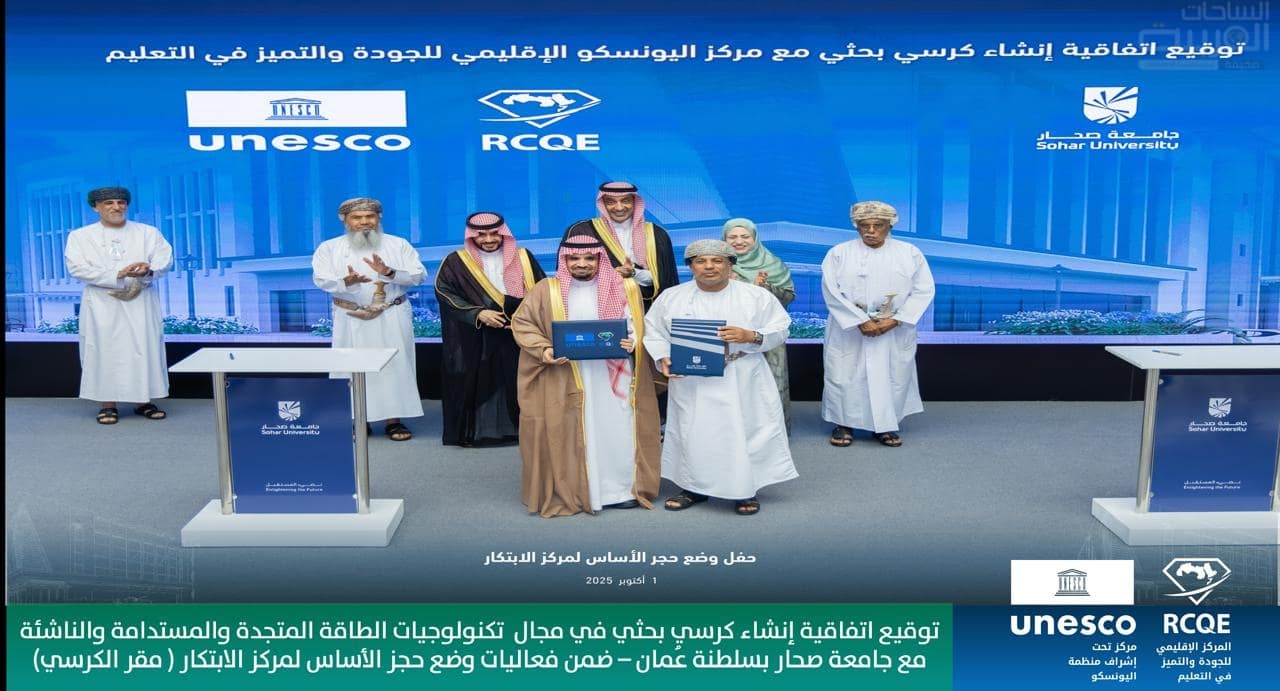 تم اليوم تحت رعاية وحضور معالي الأستاذة الدكتورة رحمة بنت إبراهيم المحروقية وزيرة التعليم العالي والبحث العلمي والابتكار بسلطنة عمان، و الدكتور حمدان بن سليمان الفزاري رئيس جامعة صحار وعدد من أصحاب السعادة، قيادات جامعة صحار بمجلس الأمناء ومجلس الإدارة للجامعة، بجامعة صحار للاحتفاء بوضع حجر الأساس لمركز الابتكار وإعلان الشراكة مع جامعة صحار لتأسيس كرسي علمي ( بحثي ) لمركز اليونسكو الإقليمي للجودة والتميز في التعليم بجامعة صحار (سلطنة عمان) بمجال تكنولوجيات الطاقة المتجددة والمستدامة الناشئة ولمدة خمس سنوات تبدأ في 1 أكتوبر 2025 وتنتهي في 1 أكتوبر 2030 وهي شراكةٌ تُجسِّد الالتزام المشترك بتعزيز جودة التعليم والبحث والابتكار، وإسناد التحوّل المستدام وطنيًا وإقليميًا ودوليًا ؛ لحظةٌ تؤذن بالانتقال من الرؤية إلى الإطلاق، ومن الطموح إلى التنفيذ والأثر.في خطوة نوعية لتعزيز البحث التطبيقي، وبناء القدرات، ونقل المعرفة بما يدعم أولويات الاستدامة واقتصاد المعرفة.