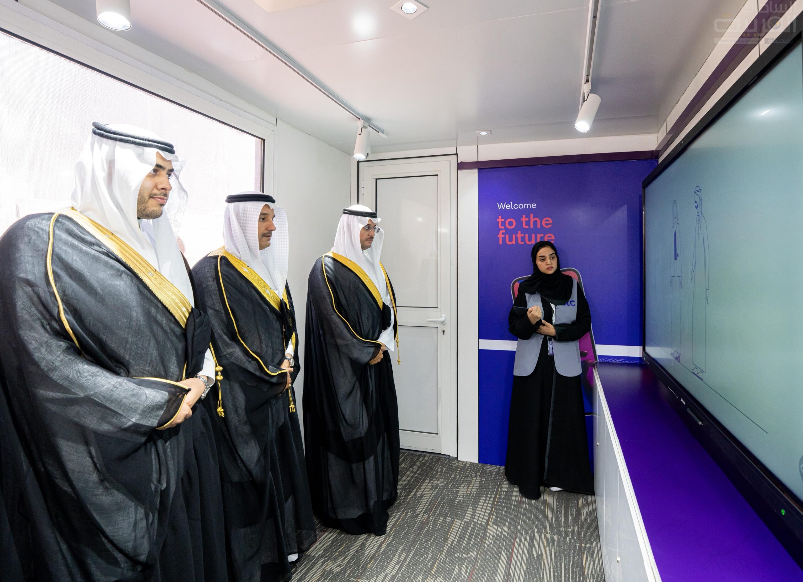 واطّلع سموّه على مكونات الحافلة الرقمية، واستمع إلى شرح مفصل حول تجهيزاتها التقنية، وآلية تقديم البرامج التدريبية والتوعوية للفئات المستهدفة، مؤكدًا أهمية إيصال هذه الخدمات لكافة أفراد المجتمع بأساليب مبتكرة وسهلة الوصول.
