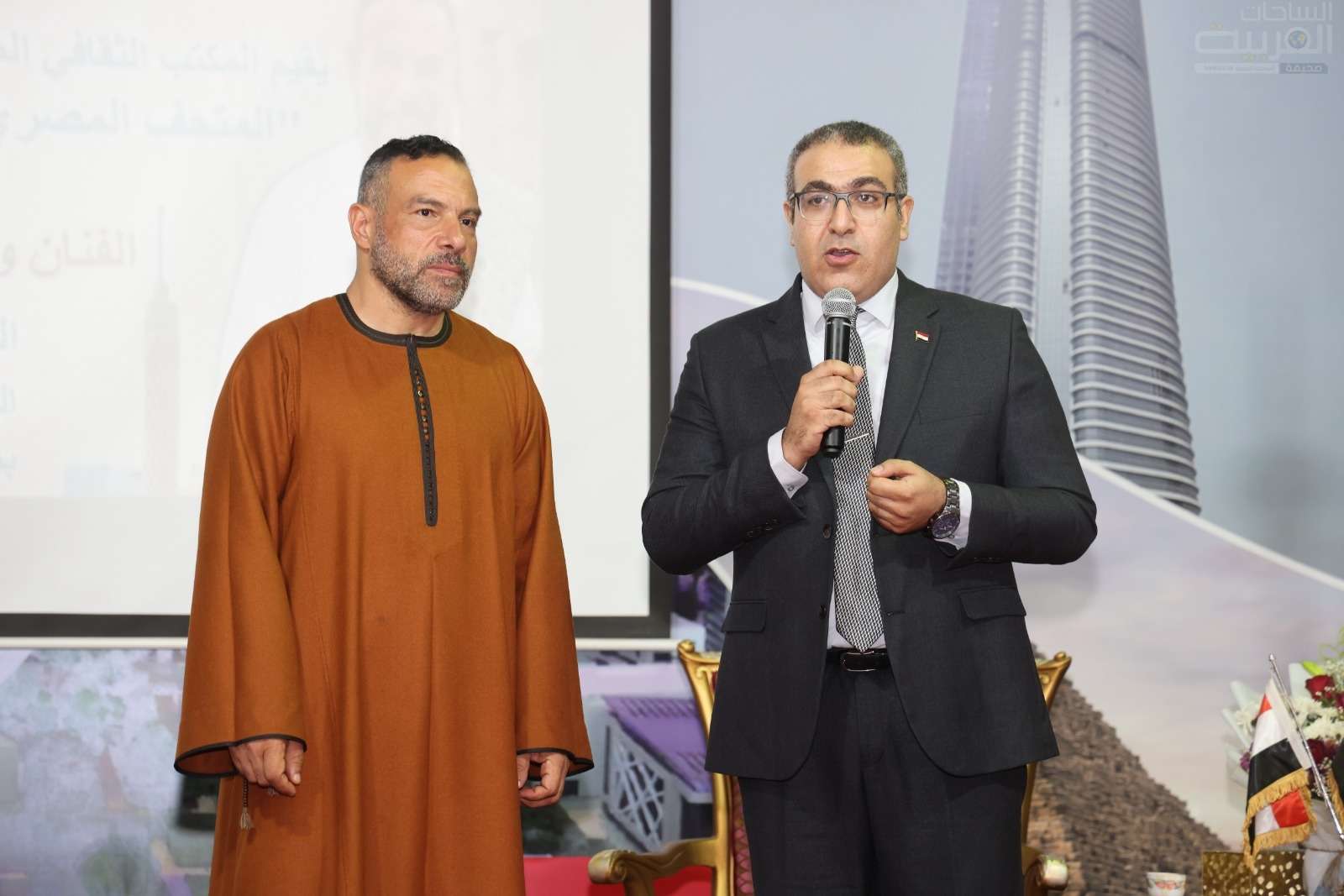 ومن جانبه؛ قدم المؤرخ المصري الدكتور محمد خميس عرضًا ضافيًا ومتكاملاً عن أقسام المتحف المصري الكبير ومحتوياته وربطها بالتاريخ، وتحدث باستفاضةٍ عن عظمة الحضارة المصرية القديمة، والقيمة الحضارية التي يمثلها المتحف، مشيرًا إلى أهمية الموقع الجغرافي للمتحف بالقرب الأهرامات وما تمثله من رمزية كبيرة في الحضارة المصرية القديمة.