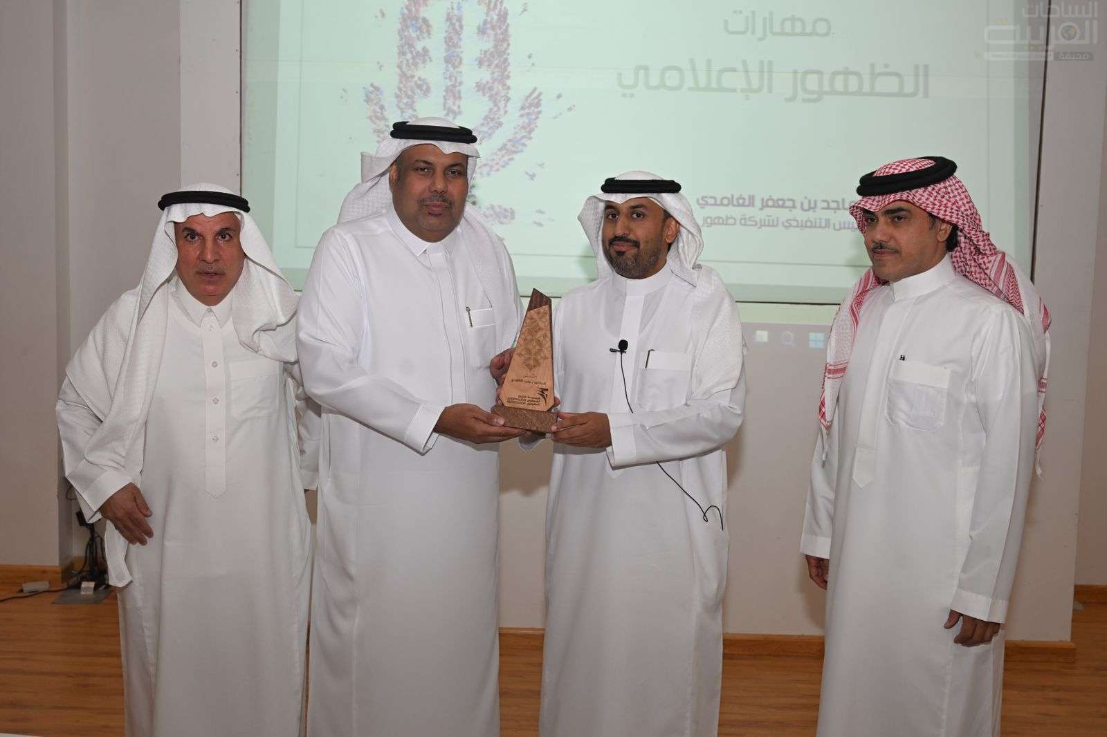بدوره أكد مدير فرع الهيئة الأستاذ بدر الشهاب أن الورشة كانت فرصة قيمة لتبادل الخبرات والمعرفة حول كيفية الظهور الإعلامي الفعال مبينا أن أهمية الورشة “الظهور الإعلامي” هو جزء رئيسي من العمل الصحفي والورشة قدمت أدوات وتقنيات قيمة للظهور الإعلامي المتميز وأن الحضور اكتسبوا العديد من المعارف والمهارات في الورشة وكانت الورشة فرصة لتعزيز المهارات وتطوير الأداء الإعلامي موجها شكره وتقديره للمحاضر في الورشة الدكتور ماجد الغامدي والشكر موصول لفريق العمل على التنظيم. وفي الختام، سلم الشهاب درع فرع الهيئة للمحاضر الغامدي.