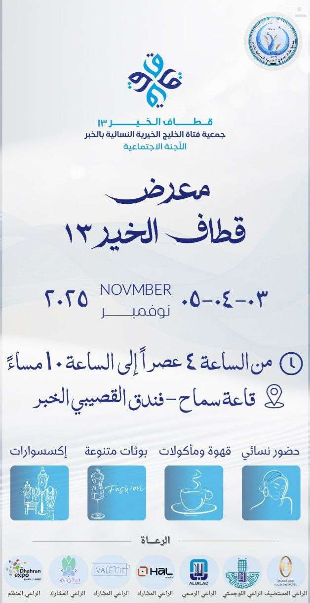 برعاية كريمة من صاحبة السمو الأميرة عبير بنت فيصل بن تركي آل سعود، تطلق اللّجنة الاجتماعية بجمعية فتاة الخليج الخيرية النسائية بالخبر، معرض قِطاف الخير (13)، وذلك يوم الاثنين 3 نوفمبر 2025م الموافق 12 جمادى الأولى 1447هـ، يستمر ثلاثة أيام، وذلك في قاعة سماح بفندق القصيبي بالخبر، من الساعة الرابعة عصرًا وحتى الحادية عشر مساءً.