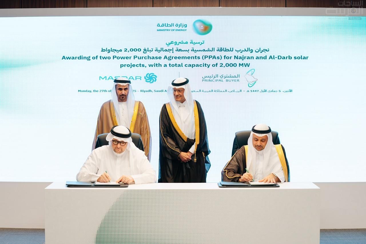 مشروع نجران للطاقة الشمسية، في منطقة نجران، مع شركة أبو ظبي لطاقة المستقبل (مصدر)، بسعة تبلغ 1400ميجاواط، وتكلفة إنتاجية (LCOE) تبلغ4.11307 هللات لكل كيلوواط ساعة (1.09682) سنت أمريكي لكل كيلوواط ساعة، وهو ثاني أقل رقمٍ قياسي جديد في تكلفة إنتاج الكهرباء من الطاقة الشمسية في العالم، بعد مشروع (الشعيبة 1) في المملكة كذلك.