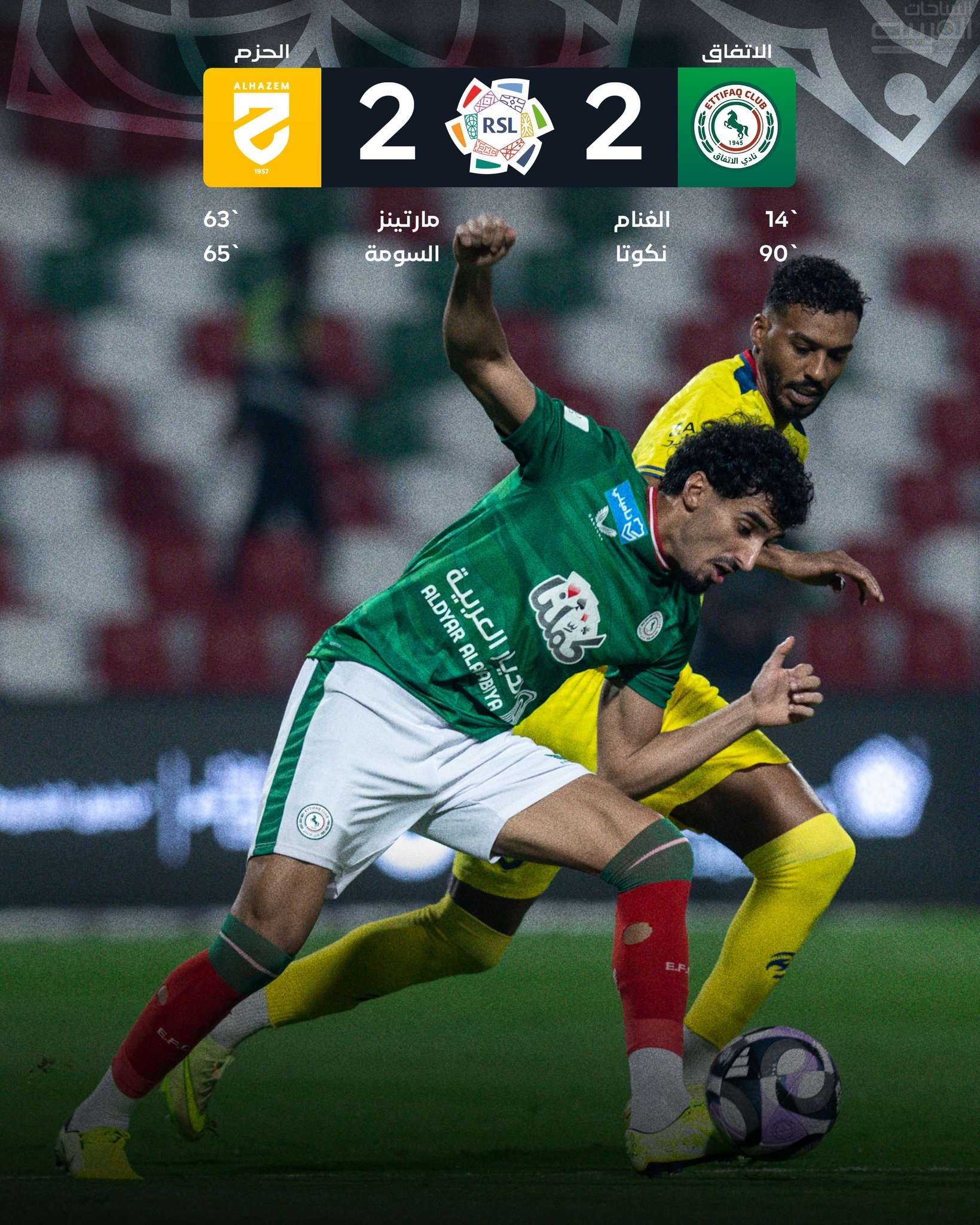 وبهذه النتيجة، رفع الاتفاق رصيده إلى 8 نقاط، فيما وصل الحزم إلى 6 نقاط في سلم ترتيب دوري روشن السعودي.