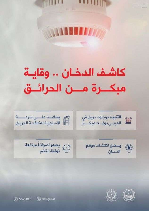 أكدت المديرية العامة للدفاع المدني أهمية أجهزة كاشف الدخان في المباني ودورها في حماية الإنسان والمحافظة على الممتلكات؛ لتفادي وقوع الخسائر وتعجيل عمليات الإخلاء.