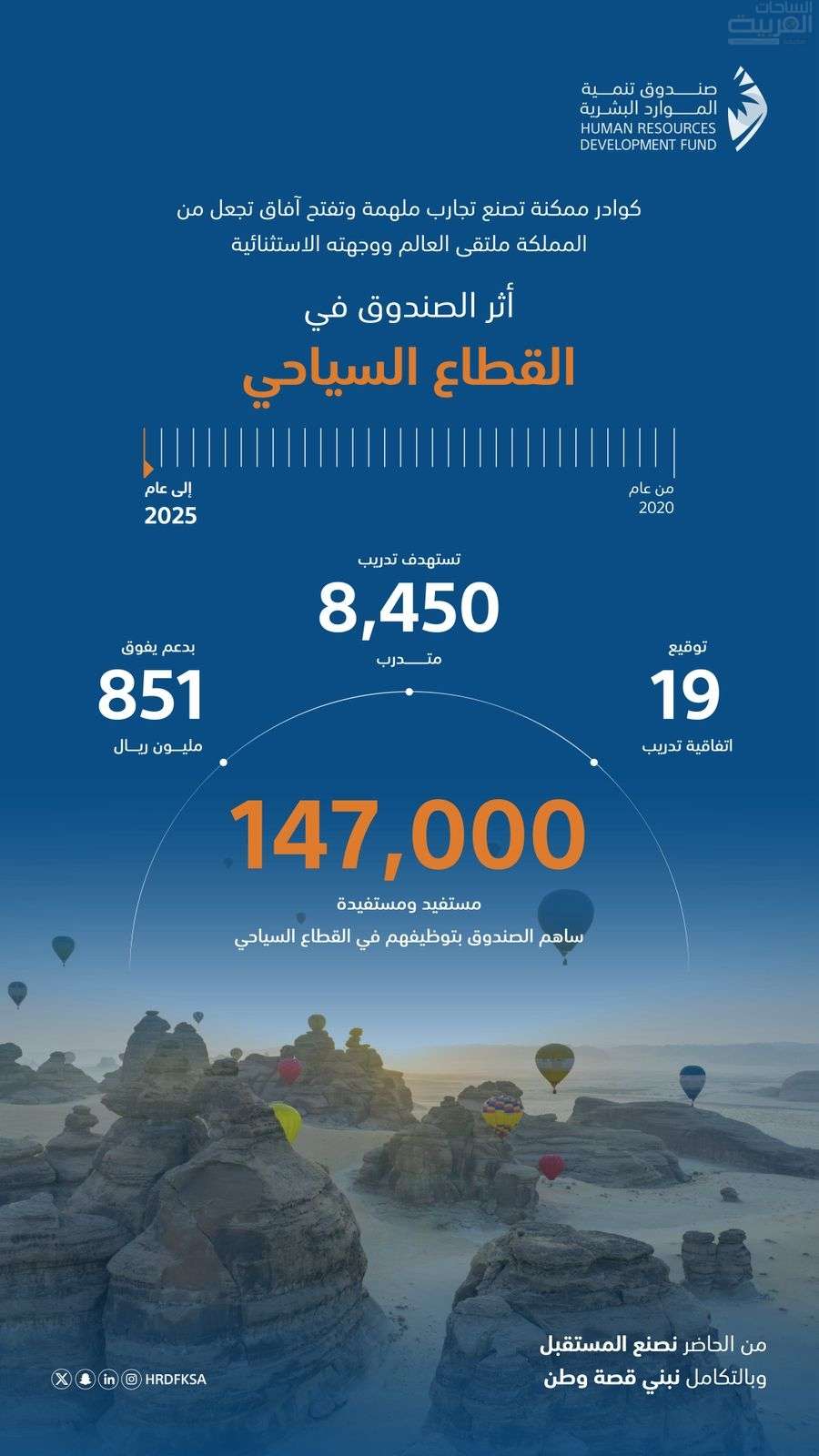 استمرارًا لدور صندوق تنمية الموارد البشرية المحوري في تمكين رأس المال البشري ورفد القطاعات الاقتصادية الواعدة بالكفاءات الوطنية، أسهمت الشراكة الاستراتيجية للصندوق مع قطاع السياحة في المساهمة بتوظيف 147 ألف مواطن ومواطنة في القطاع خلال الفترة من عام 2020 حتى نهاية النصف الأول من عام 2025م.