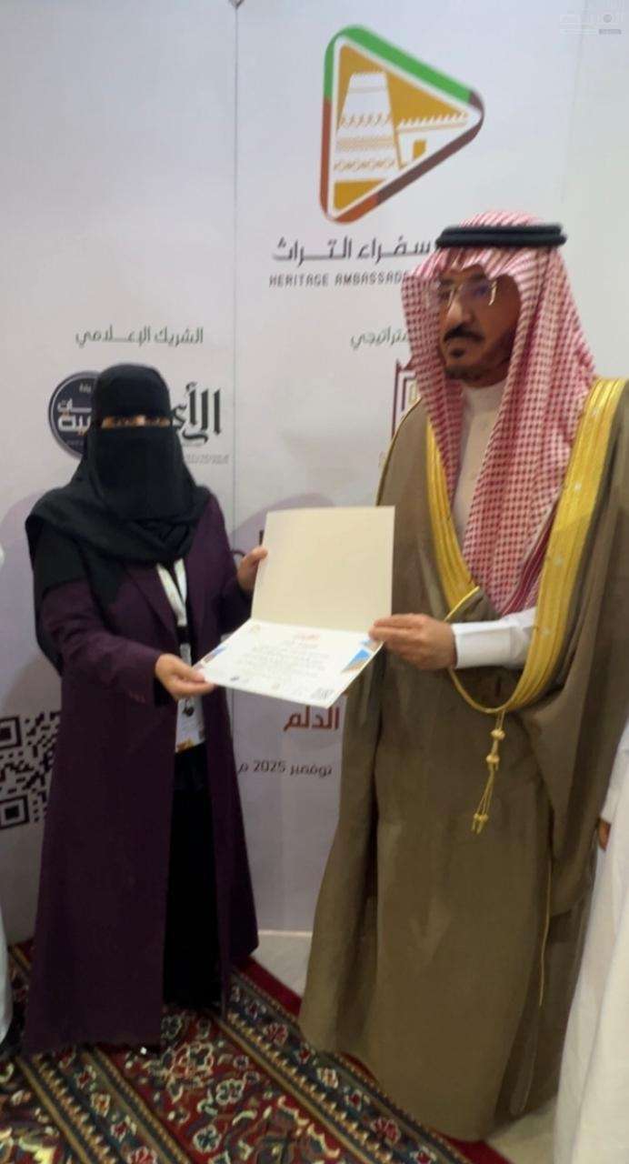 كرمت جمعية سفراء التراث صحيفة الساحات العربية الراعي الاعلامي للجمعية وقت تسلمتها عضو الصحيفة الاعلامية سفيرة التراث مها الرميح