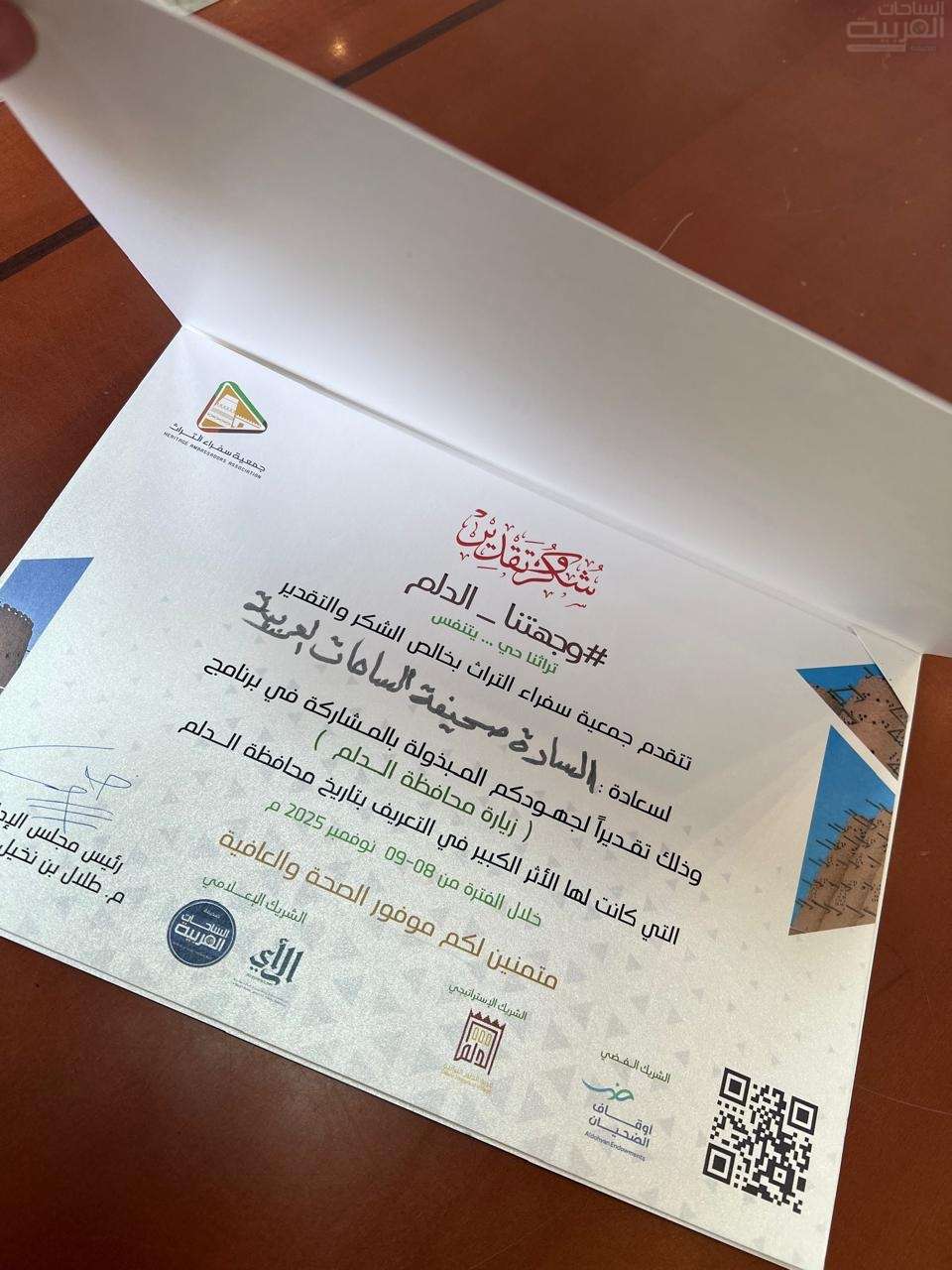 وقد تسلمتها من محافظ محافظة الدلم سعادة الاستاذ / محمد بن عبدالعزيز الثاقب وبحضور وفد جمعية سفراء التراث برئاسة المهندس طلال الشرهان