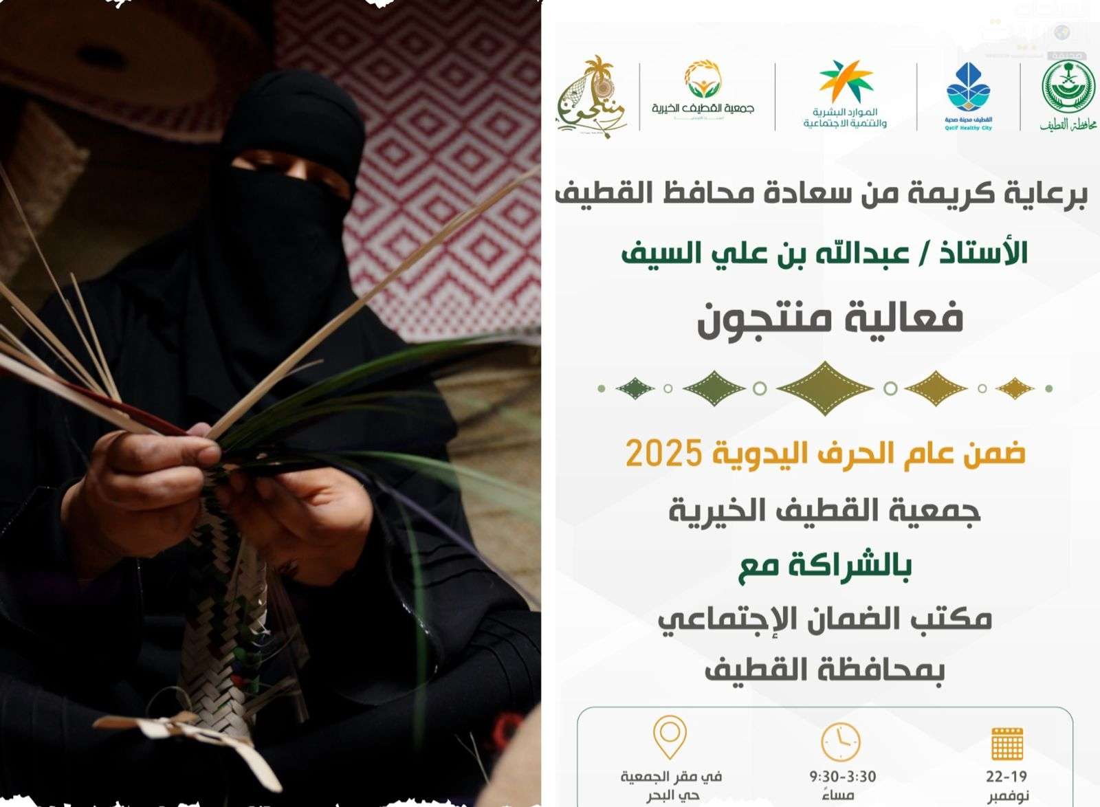 برعاية كريمة من سعادة محافظ القطيف الأستاذ عبدالله بن علي السيف، تستعد جمعية القطيف الخيرية وبالتعاون مع مكتب الضمان الاجتماعي بالقطيف لإطلاق فعالية «منتجون» للأسر المنتجة، حيث تنطلق الفعالية يوم الأربعاء 19 نوفمبر الجاري الموافق 28 جمادى الأولى 1447هـ، وتستمر لمدة أربعة أيام في مقر الجمعية بحي البحر.