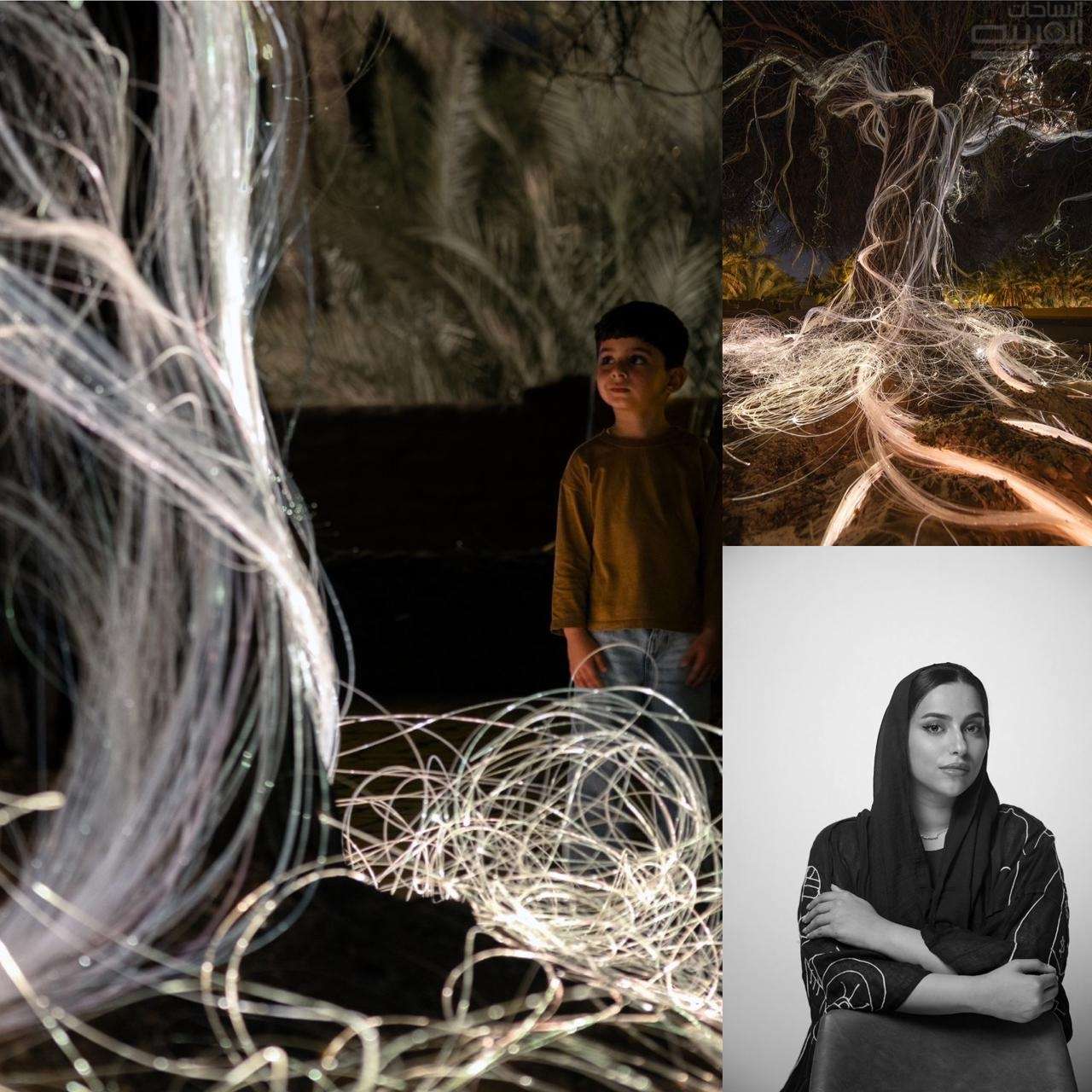 يستمع العمل الفني “نَفَس المكان/ نفس المكان” إلى أصوات بستان النخيل في واحة الجيمي، حيث تتوسّط المشهد شجرة الجِرت بظلها الممتد لستة أمتار. تتدلى من أغصانها حبال ضوئية متفاوتة الطول. تستجيب المستشعرات لحركة الزائرين، مما يؤدي إلى تغيير وهج الضوء مع مرورهم، وكأن الشجرة تتنفّس معهم.