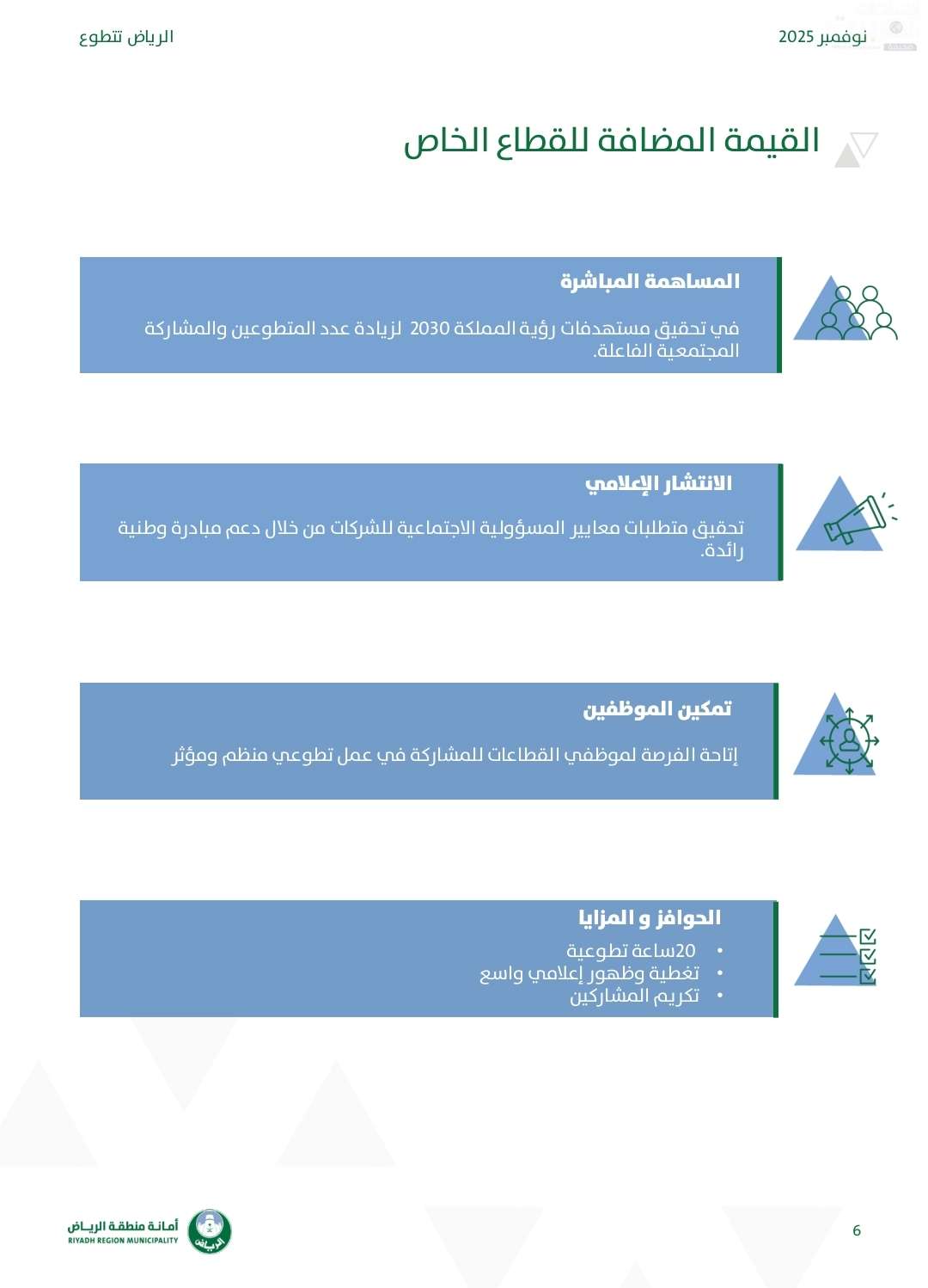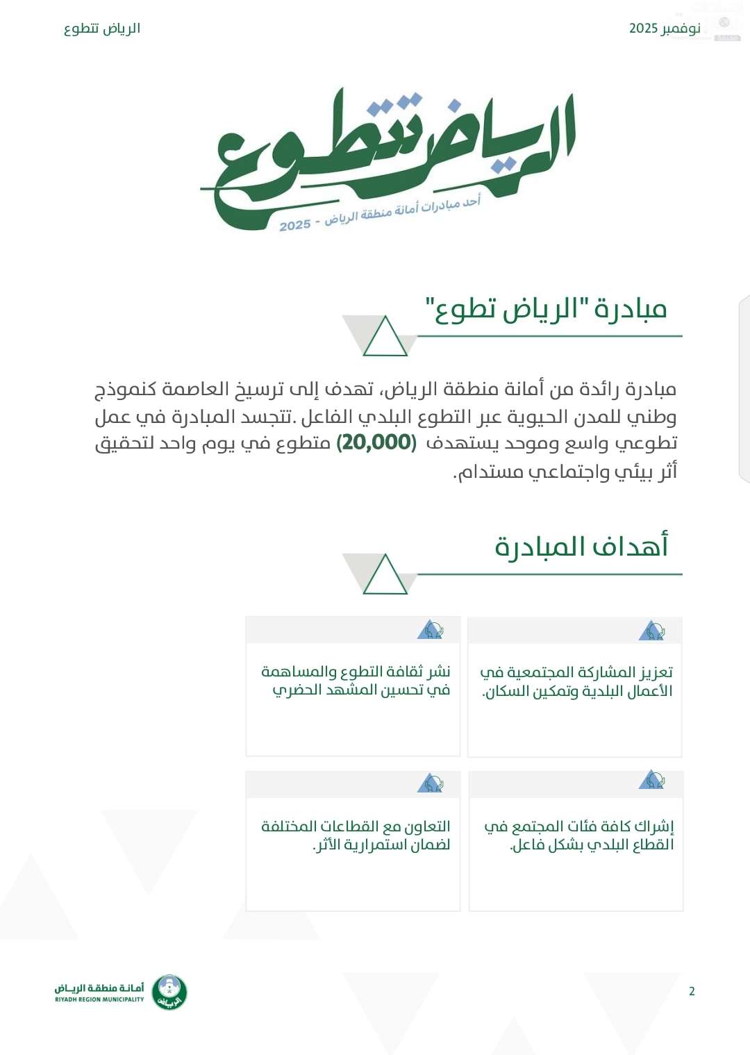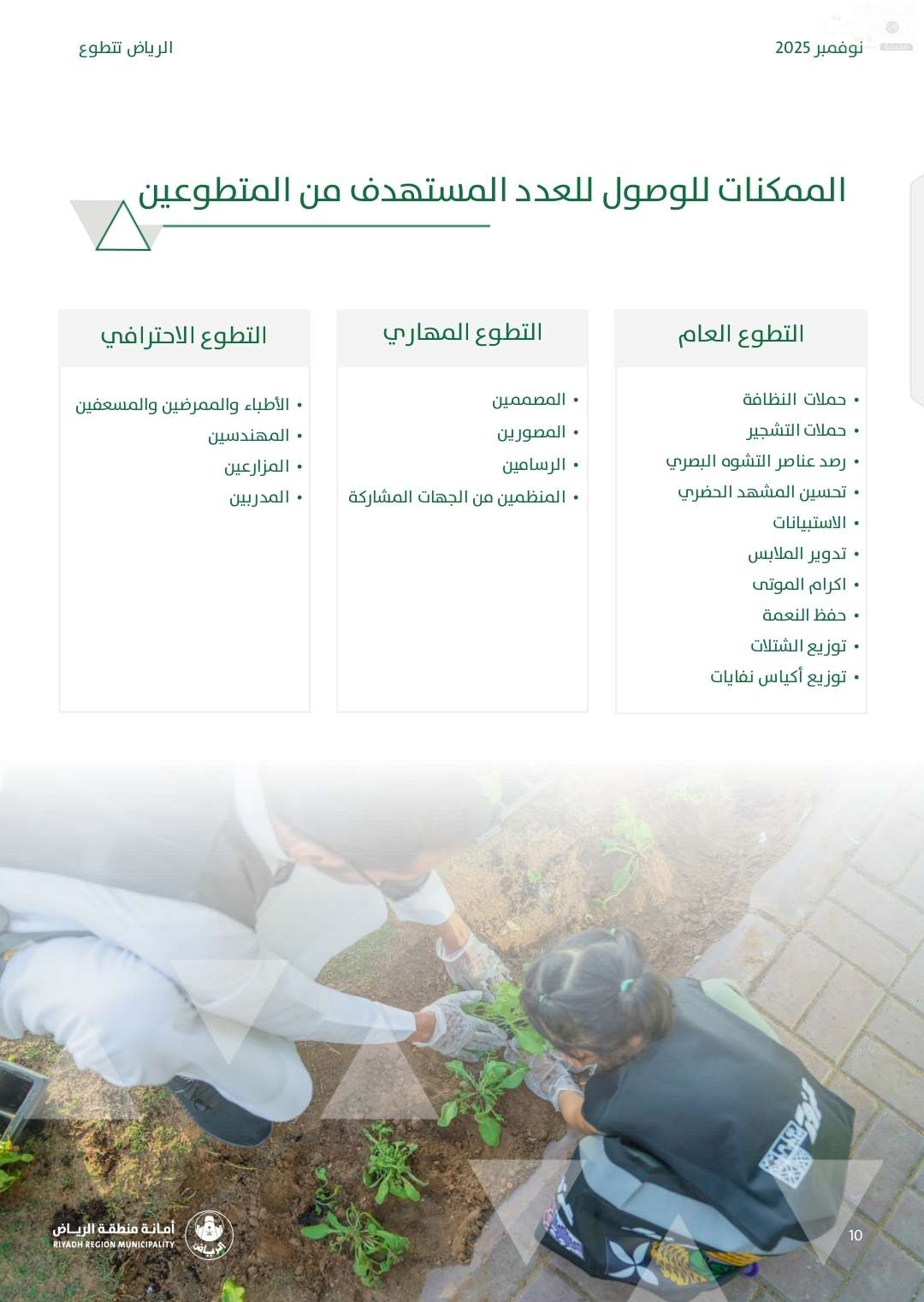 ضمن مبادرات أمانة منطقة الرياض تحت مسمى “الرياض تتطوع” تعتزم بلدية المجمعة إقامة مبادرة تطوعية وتهدف هذه المبادرة إلى تنفيذ عمل تطوعي واسع يضم 20,000 متطوع في يوم واحد، بما يحقق أثرًا بيئيًا واجتماعيًا مستدامًا في مختلف مواقع المنطقة.وتهدف المبادرة تشمل: تعزيز المشاركة المجتمعية وتنمية روح التطوع. وتحسين المشهد الحضري ورفع جودة الحياة و المساهمة في حماية البيئة واستدامة الموارد و دعم الجهات الحكومية والخاصة في مبادراتها التطوعية المشتركة اضافة إلى تعزيز الشراكات المجتمعية وتحقيق أثر ملموس في وقت قياسي.