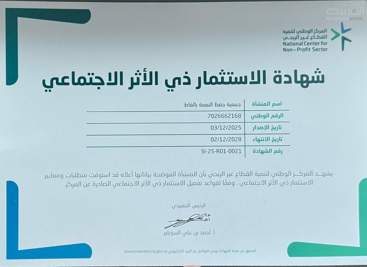 جمعية حفظ النعمة تحصل على شهادة الاستثمار ذي الأثر الاجتماعي من المركز الوطني لتنمية القطاع غير ربحي الدفعة الأولى