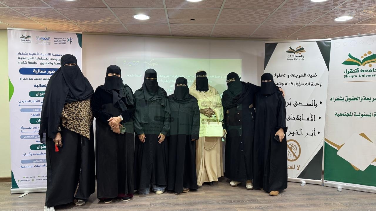 نظمت جمعية التنمية الأهلية بشقراء، بالتعاون مع جامعة شقراء ممثلة في كلية الشريعة والحقوق، فعاليةً بمناسبة اليوم العالمي لمناهضة العنف ضد المرأة، وذلك في إطار جهودها لنشر الوعي المجتمعي وتعزيز الحماية وتمكين المرأة.