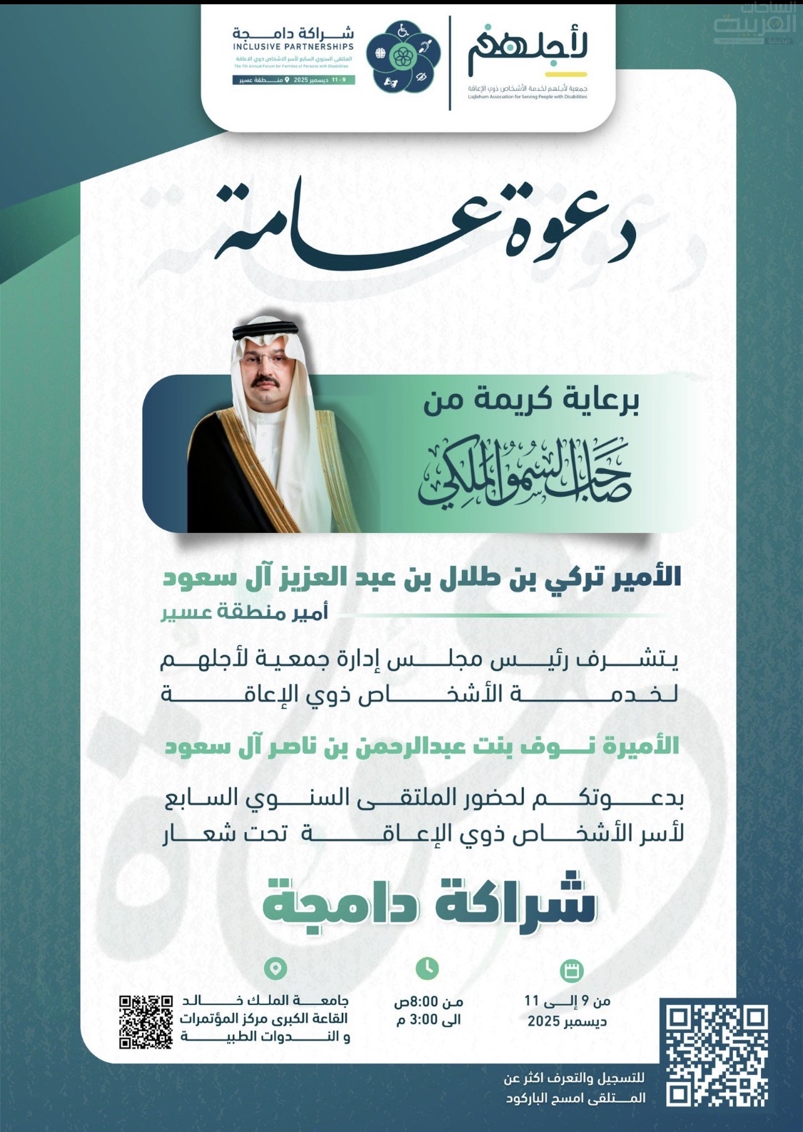 الملتقى السنوي السابع لأسر الأشخاص ذوي الإعاقة، تحت شعار “شراكة دامِجة”، وذلك في مركز المؤتمرات والندوات الطبية بجامعة الملك خالد.