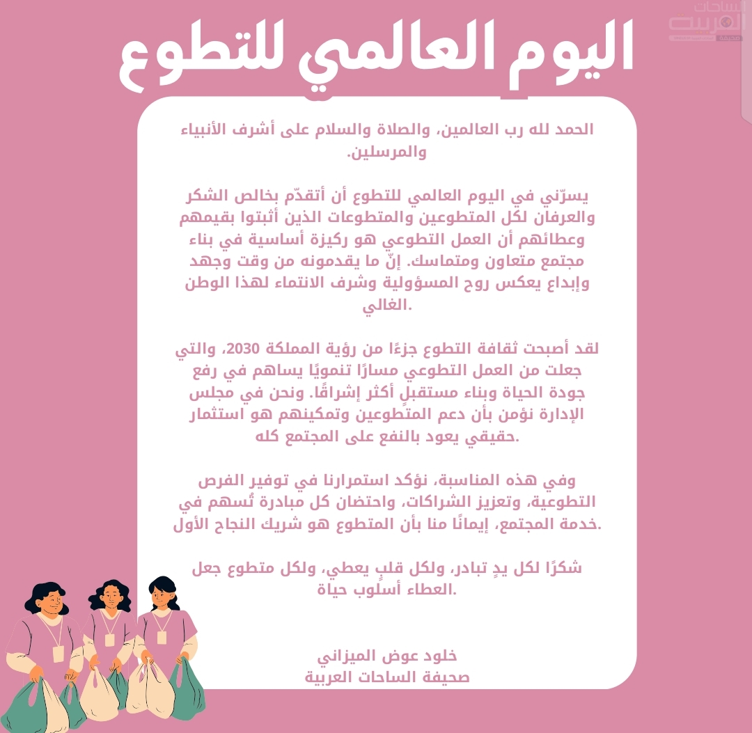 يسرّني في اليوم العالمي للتطوع أن أتقدّم بخالص الشكر والعرفان لكل المتطوعين والمتطوعات الذين أثبتوا بقيمهم وعطائهم أن العمل التطوعي هو ركيزة أساسية في بناء مجتمع متعاون ومتماسك. إنّ ما يقدمونه من وقت وجهد وإبداع يعكس روح المسؤولية وشرف الانتماء لهذا الوطن الغالي.