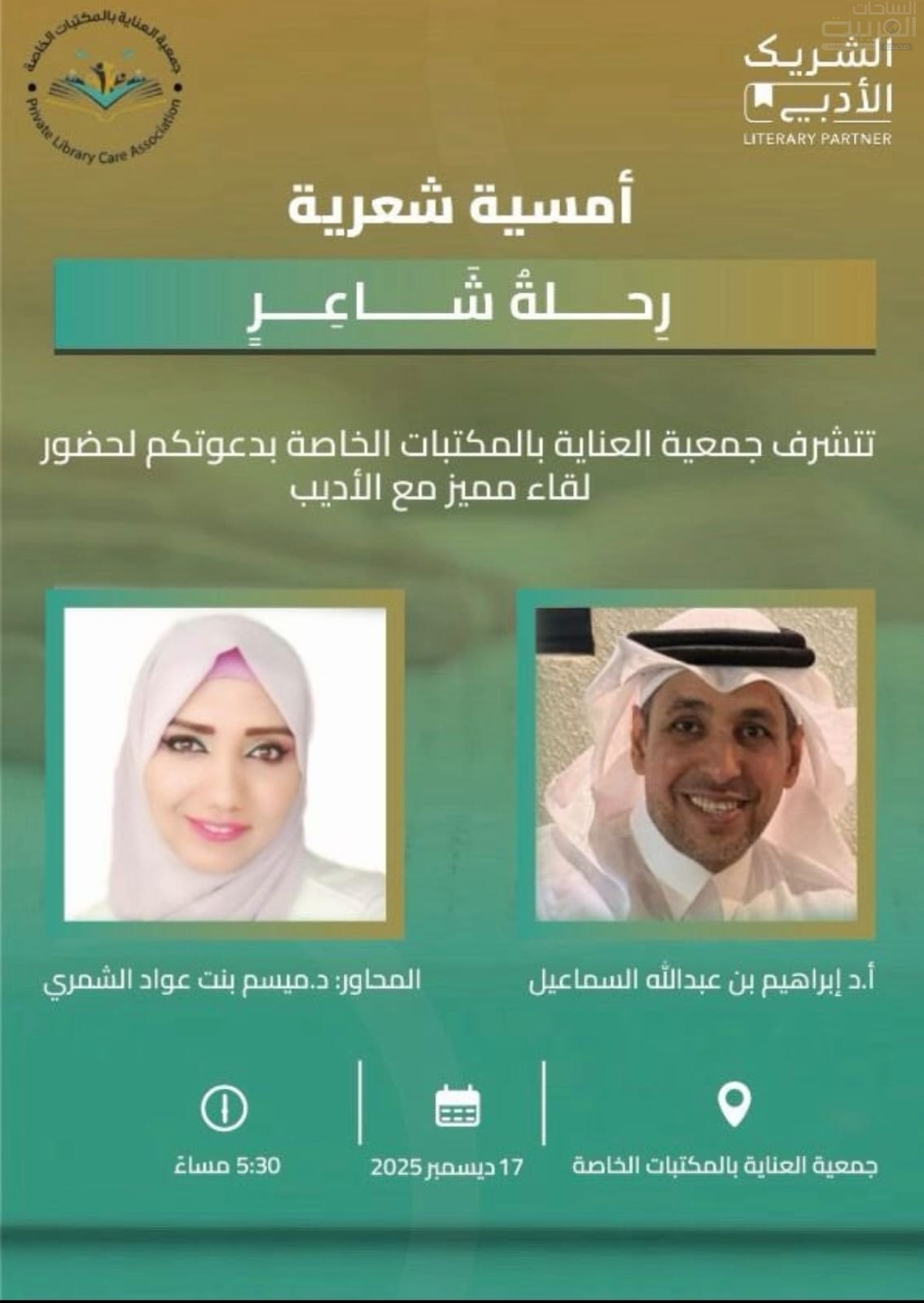 أقامت جمعية العناية بالمكتبات الخاصة أمسية: رحلة شاعر مع البروفيسور إبراهيم السماعيل؛ تحتَ مظلّةِ مبادرة الشريكِ الأدبيِّ المنبثقة عن هيئةِ الأدبِ والنشرِ والترجمةِ بوزارةِ الثقافة النسخة الخامسة، وسطَ حضورٍ أدبيٍّ وإعلاميٍّ لافتٍ من الكُتّابِ والمثقّفين من السعودية وخارج السعودية.