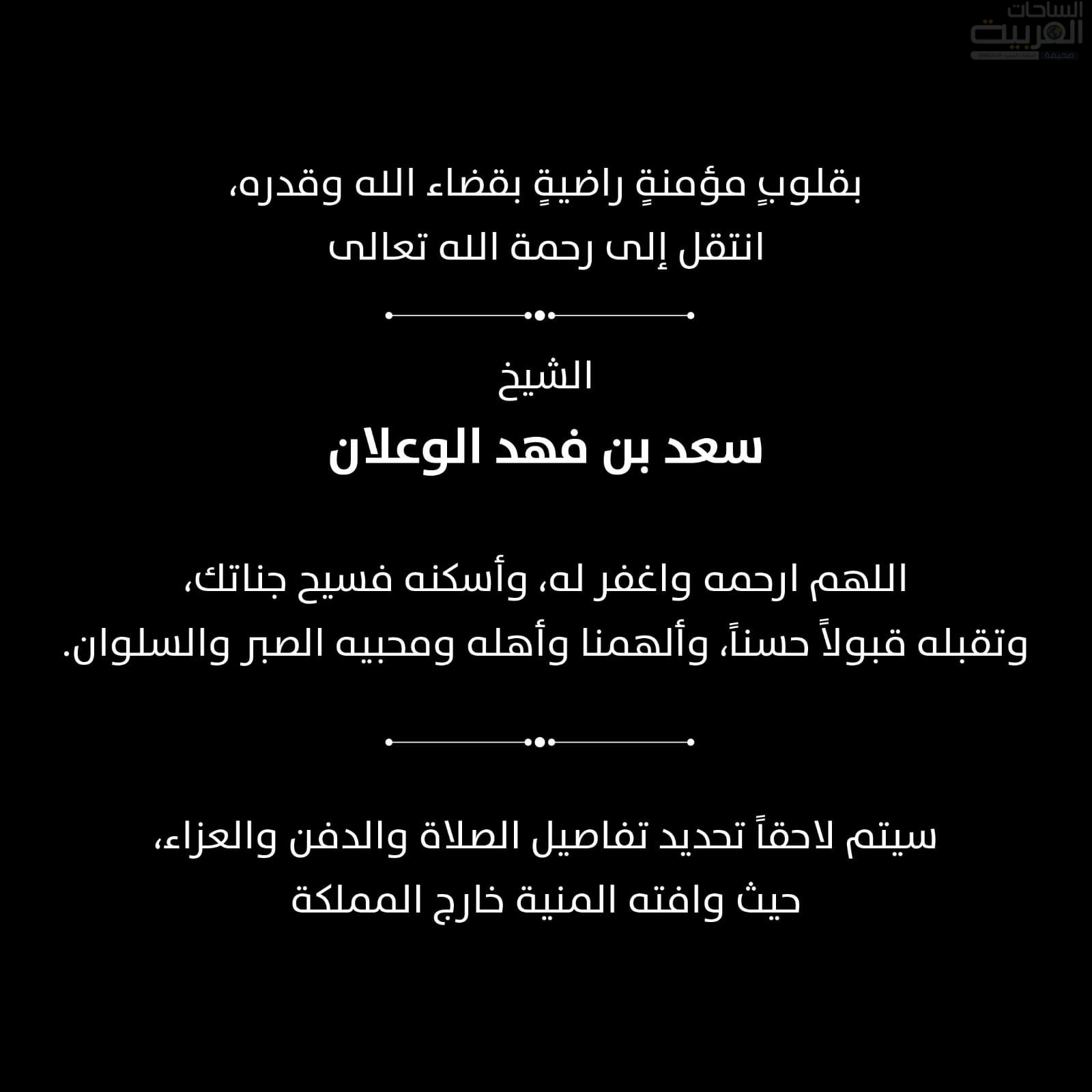 انتقل إلى رحمة الله تعالى الشيخ سعد بن فهد الوعلان مؤسس شركة الوعلان للتجارة، وذلك خارج المملكة،