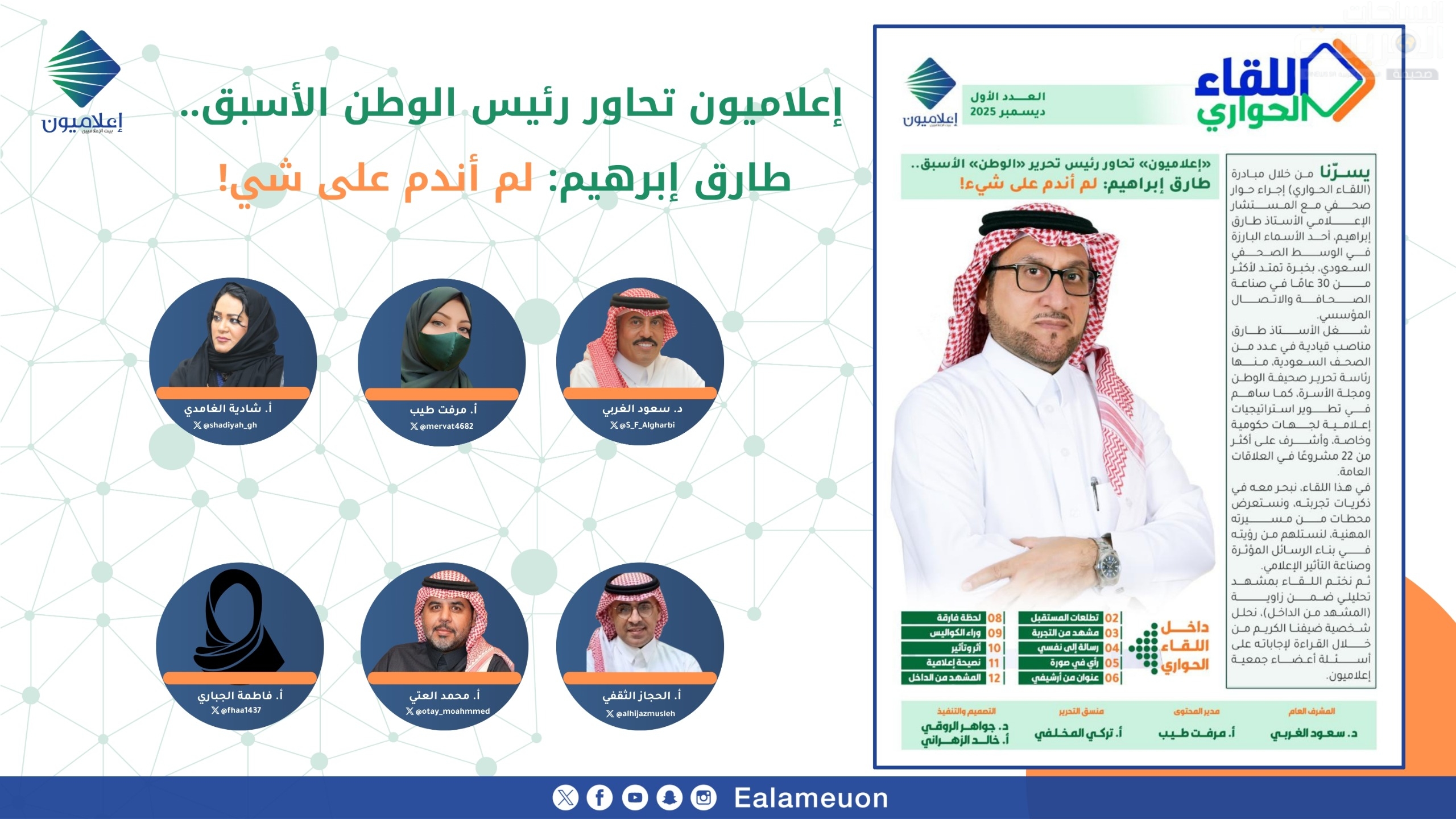 أعلن رئيس مجلس إدارة جمعية «إعلاميون» الدكتور سعود الغربي عن إصدار مجلة «اللقاء الحواري»، وهي مجلة إعلامية متخصصة تُعنى بإجراء الحوارات الصحفية وتسليط الضوء على التجارب المهنية والسير الذاتية لرواد الإعلام السعودي في مختلف المجالات، بما يشمل الإذاعة والتلفزيون والصحافة، إلى جانب المجالات الأكاديمية المرتبطة بالإعلام.