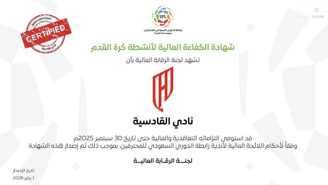 أعلنت لجنة الرقابة المالية لأندية رابطة الدوري السعودي للمحترفين، صدور شهادة الكفاءة المالية لأنشطة كرة القدم لنادي القادسية، وذلك وفقًا لأحكام اللائحة المالية لأندية الرابطة، بعد استيفاء النادي لجميع المتطلبات والمعايير المعتمدة.