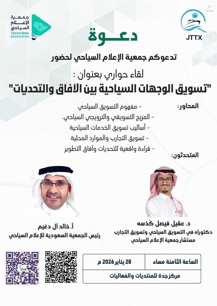 تنظم جمعية الإعلام السياحي لقاءً حواريًا بعنوان «تسويق الوجهات السياحية بين الآفاق والتحديات»، اليوم الأربعاء الموافق 28 يناير 2026، عند الساعة الثامنة مساءً، وذلك في مركز جدة للمنتديات والفعاليات، بمشاركة نخبة من المختصين والمهتمين بقطاع السياحة والإعلام.