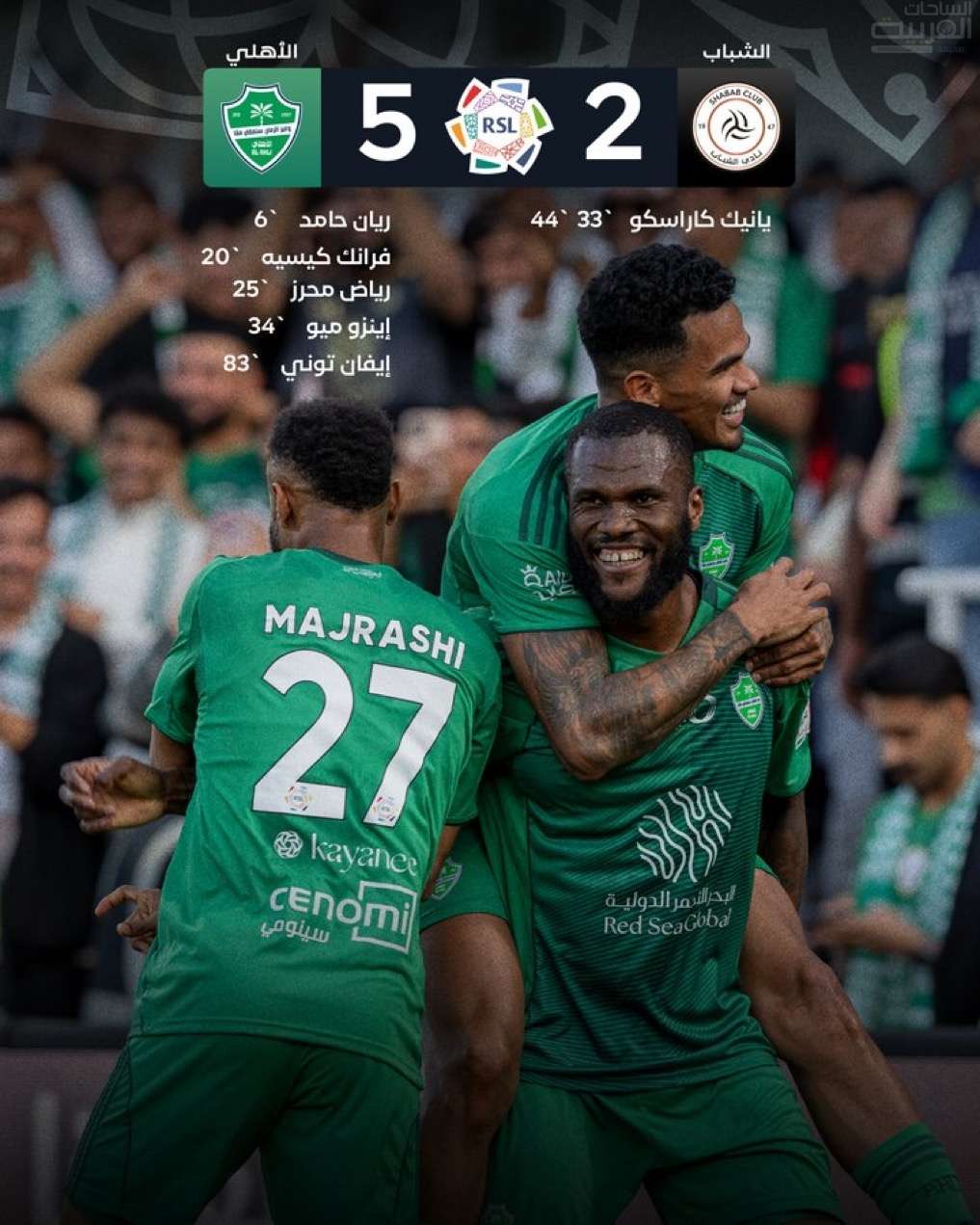اكتسح نادي الأهلي، نظيره الشباب بخمسة أهداف مقابل هدفين، في المباراة المثيرة التي جمعتهما ضمن منافسات بطولة دوري روشن ، الجمعة.