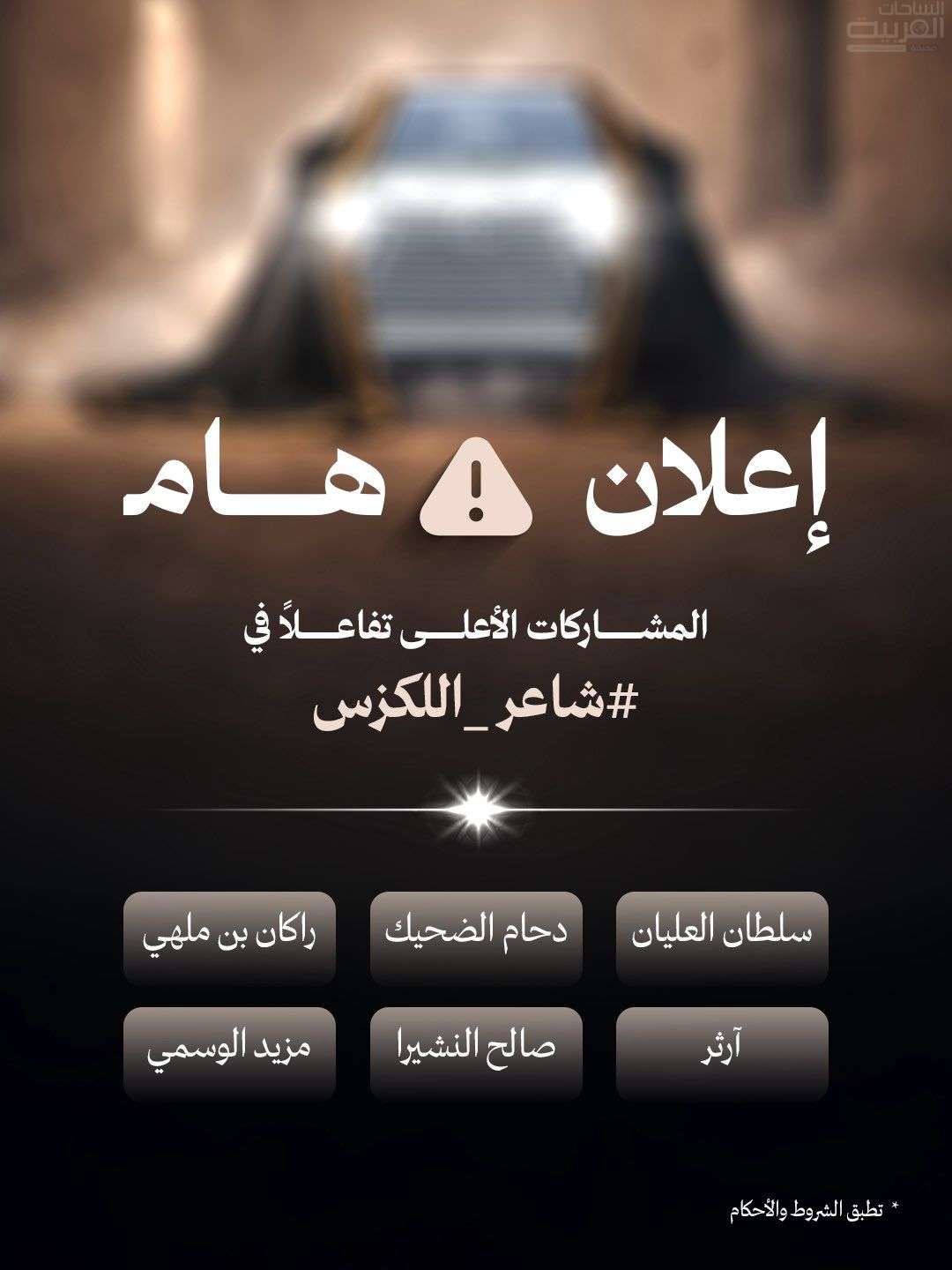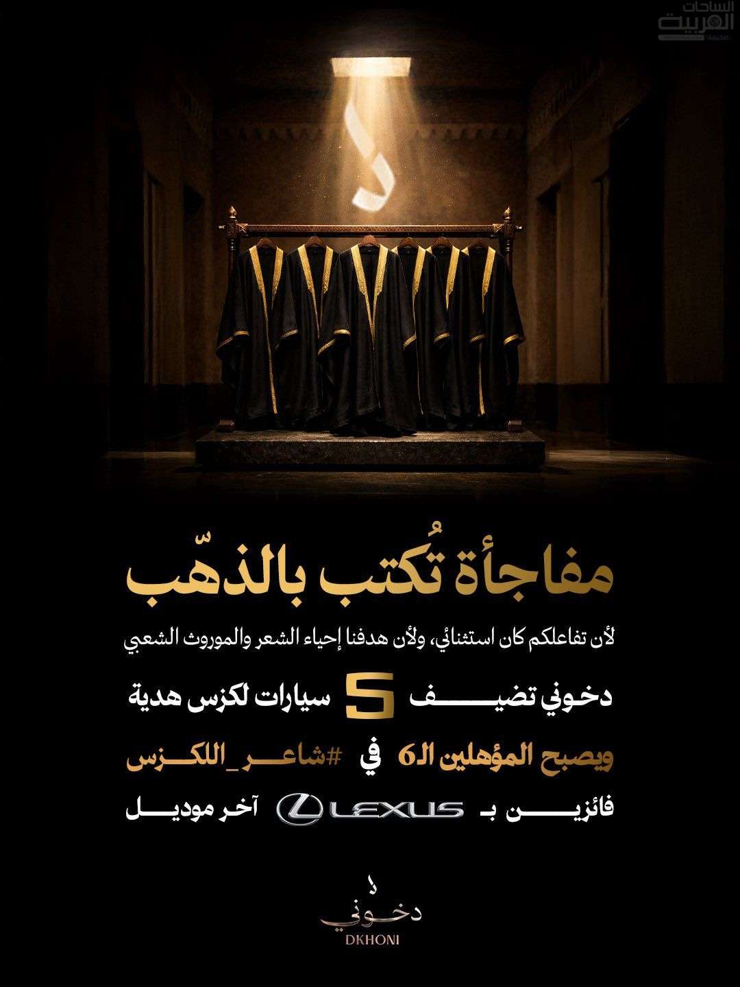 ومع تصاعد التفاعل الاستثنائي ، أعلنت الجهة المنظمة رفع سقف الجوائز من سيارة واحدة إلى ست سيارات لكزس آخر موديل من لكزس، في خطوة عززت من وهج المسابقة وأعادت تعريف مفهوم الجوائز في المنافسات الشعرية.