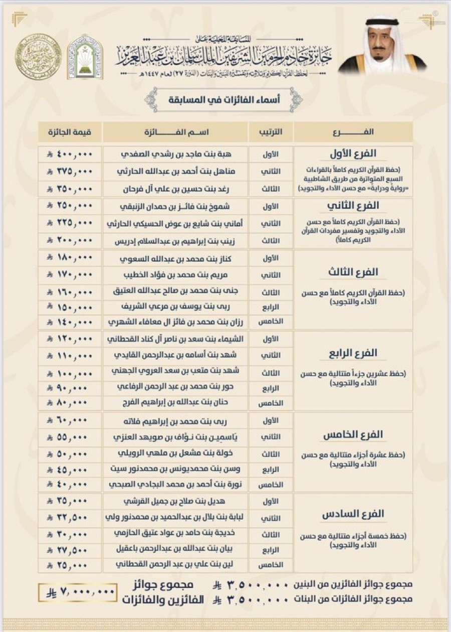 وبيّن أن الدورة الحالية شهدت إقبالًا واسعًا من مختلف مناطق المملكة، حيث شارك في تصفياتها الأولية أكثر من (3600) متسابق ومتسابقة، تأهل منهم (129) إلى المرحلة النهائية، ضمن منظومة تحكيم دقيقة بإشراف لجان متخصصة، وبلغ مجموع جوائزها (7,000,000) ريال؛ دعمًا وتحفيزًا لحفظة كتاب الله وتشجيعًا لهم على مواصلة هذا الطريق.