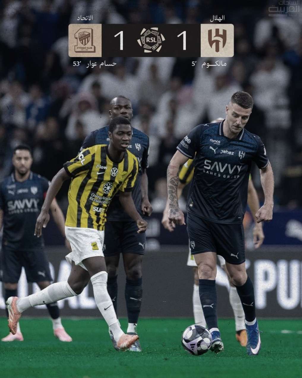 تعادل نادي الهلال على نظيره الاتحاد، بهدف لمثله ، في المباراة التي أقيمت على ملعب المملكة آرينا في الرياض، مساء السبت، وذلك ضمن منافسات الجولة الثالثة والعشرين من بطولة دوري روشن .