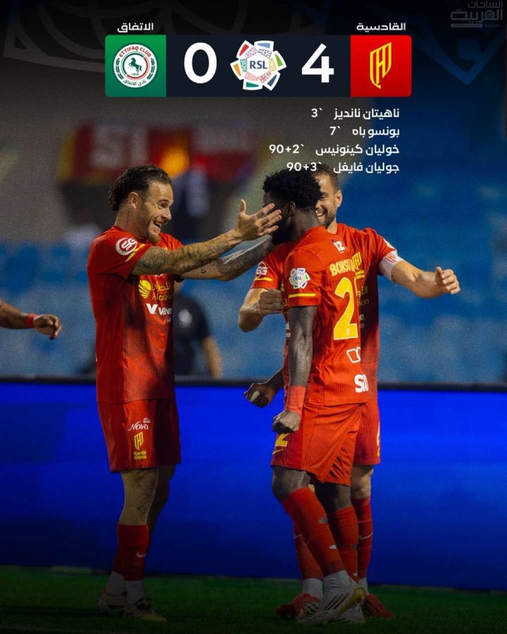 وسجل رباعية القادسية ناهيتان نانديز في الدقيقة (3)، وبونسو باه في الدقيقة (7)، وجوليان كينيونيس في الدقيقة (90+1) وجوليان فايغل في الدقيقة (90+3).