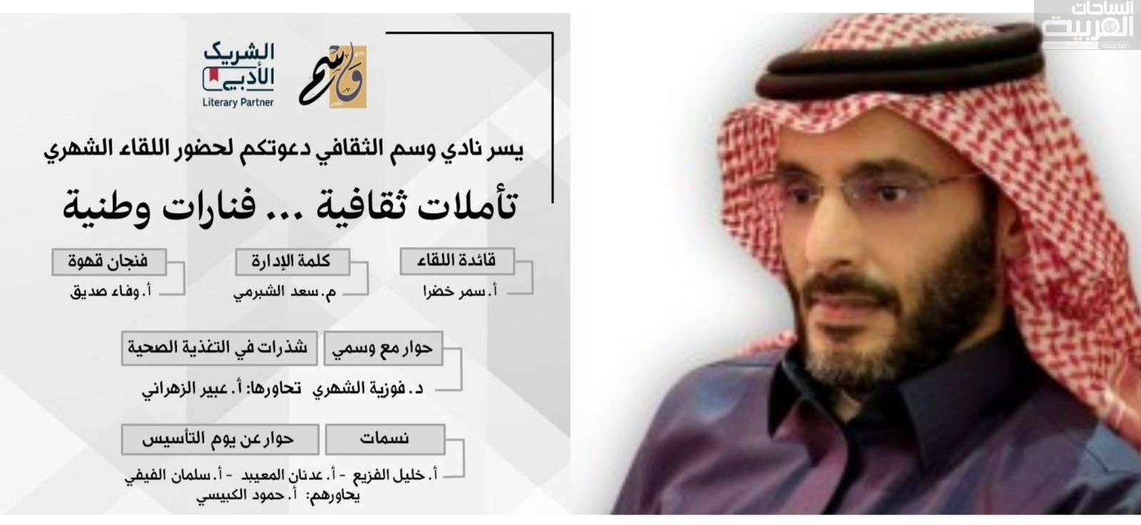 يستعد نادي وسم الثقافي لإقامة لقائه الشهري بعنوان «تأملات ثقافية… فنارات وطنية»، وذلك مساء الأربعاء 15 رمضان 1447هـ الموافق 4 مارس 2026م، عند الساعة 9:30 مساءً، على مسرح مسرح كواليس، في أمسية ثقافية تجمع بين الحوار الوطني والطرح المعرفي في أجواء رمضانية مميزة.