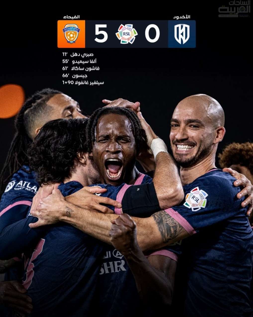 سجل أهداف الفيحاء صبري دهل (11)، وسجل ألفا سيميدو الهدف الثاني (56)، وعاد فاشيون ساكالا لتسجيل الهدف الثالث (63)، وجاء الهدف الرابع عن طريق جايسون (67)، وسجل سيلفر جانفولا الهدف الخامس (90).