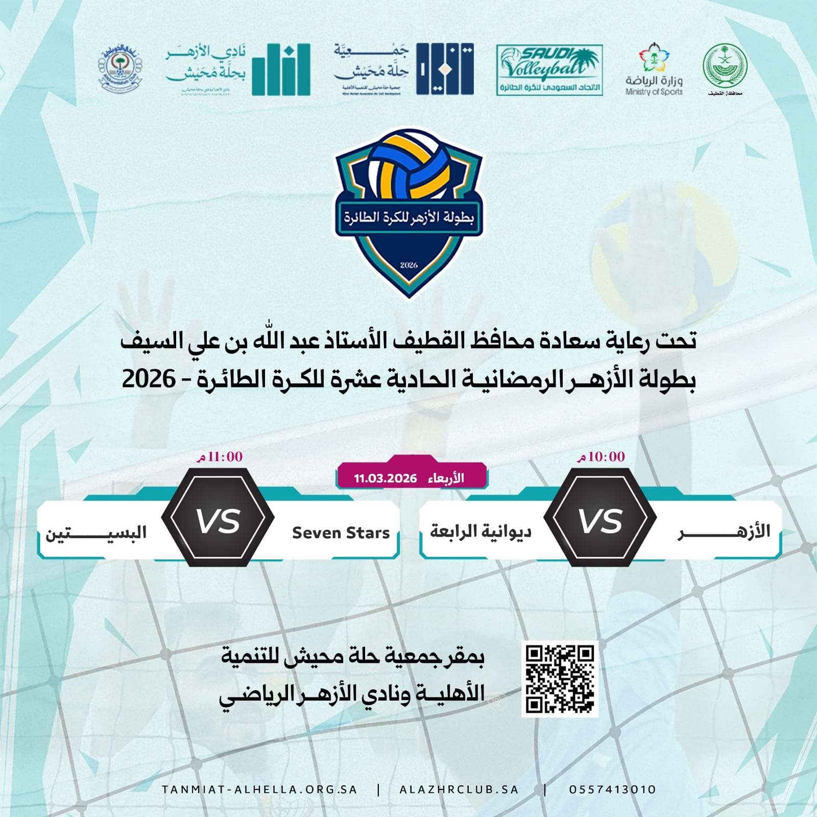 تنطلق مساء اليوم الأربعاء 11 مارس 2026 منافسات بطولة الأزهر الرمضانية الحادية عشرة للكرة الطائرة، والتي تقام تحت رعاية سعادة محافظ القطيف الأستاذ عبدالله بن علي السيف، وذلك على مقر جمعية حلة محيش للتنمية الأهلية بتنظيم مشترك مع نادي الأزهر الرياضي، وبمشاركة ستة فرق تتنافس في أجواء رياضية رمضانية مميزة.