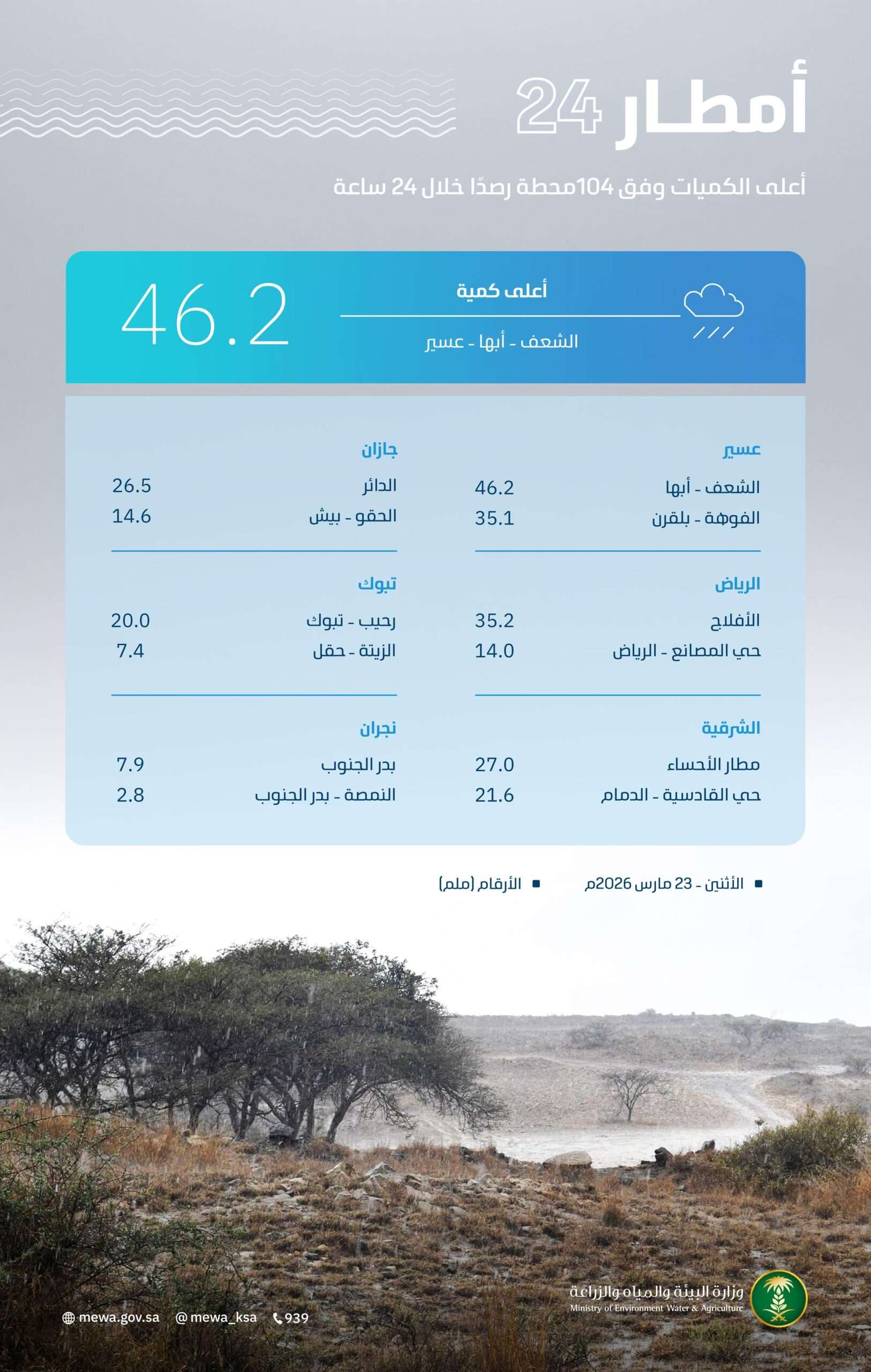 ووفقًا للتقرير اليومي لوزارة البيئة والمياه والزراعة حول رصد كميات هطول الأمطار في مناطق المملكة كافة؛ رصدت 104 محطات رصد هيدرولوجي ومناخي، خلال الأربع وعشرين ساعة الماضية، هطول أمطارٍ في مناطق (الرياض، مكة المكرمة، الشرقية، عسير، الحدود الشمالية، جازان، نجران، الباحة، والجوف).