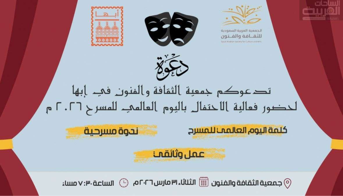 تُنظّم جمعية الثقافة والفنون في أبها مساء يوم الثلاثاء فعالية خاصة بمناسبة اليوم العالمي للمسرح، وذلك في إطار جهودها المستمرة لتعزيز الحراك الثقافي والفني في المنطقة ودعم الفنون الأدائية.
