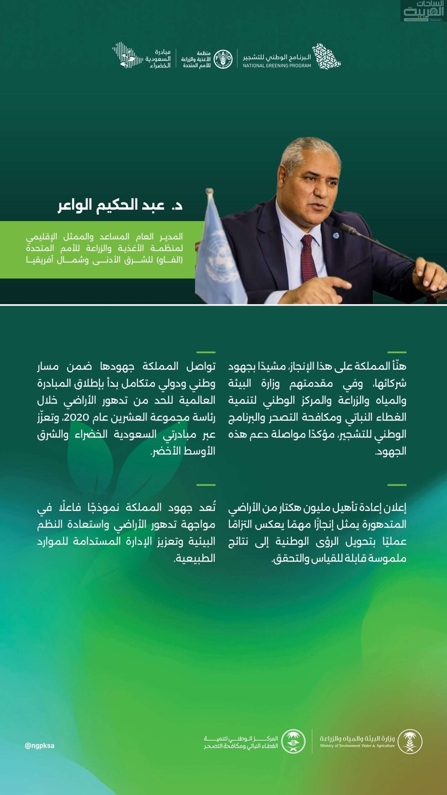 وأوضح المدير العام المساعد والممثل الإقليمي للفاو بالشرق الأدنى وشمال أفريقيا الدكتور عبد الحكيم الواعر، أن هذا الإنجاز يعكس التزامًا عمليًا بتحويل الرؤى الوطنية إلى نتائج ملموسة قابلة للقياس والتحقق، مهنّئاً جميع شركاء “الفاو” في المملكة على تحقيق هذا الإنجاز البيئي المهم، وفي مقدمتهم وزارة البيئة والمياه والزراعة، والمركز الوطني لتنمية الغطاء النباتي ومكافحة التصحر، والبرنامج الوطني للتشجير.