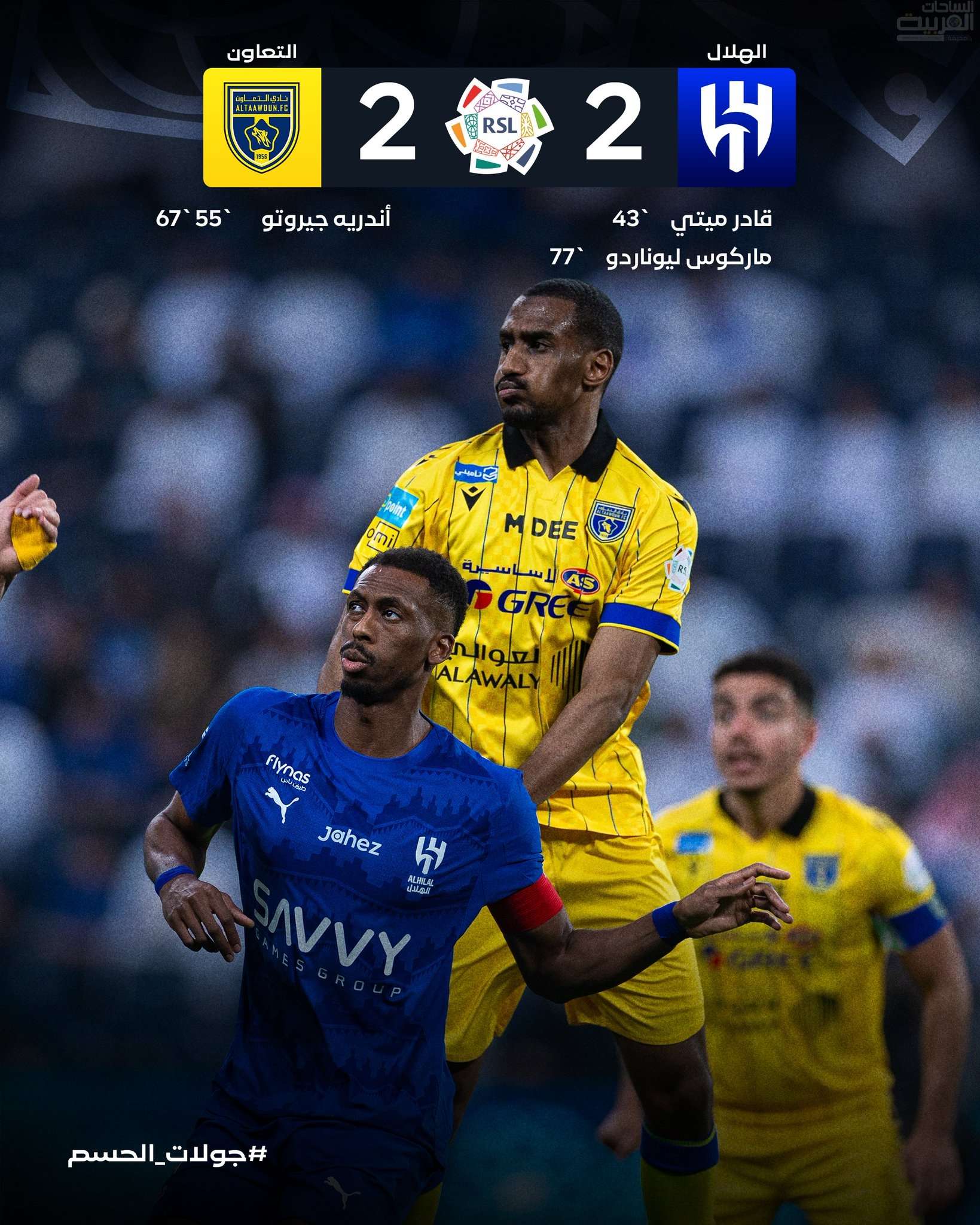 حسم التعادل الإيجابي بهدفين لكل فريق مباراة الهلال أمام التعاون، والتي أقيمت مساء السبت، ضمن منافسات الدوري السعودي للمحترفين.