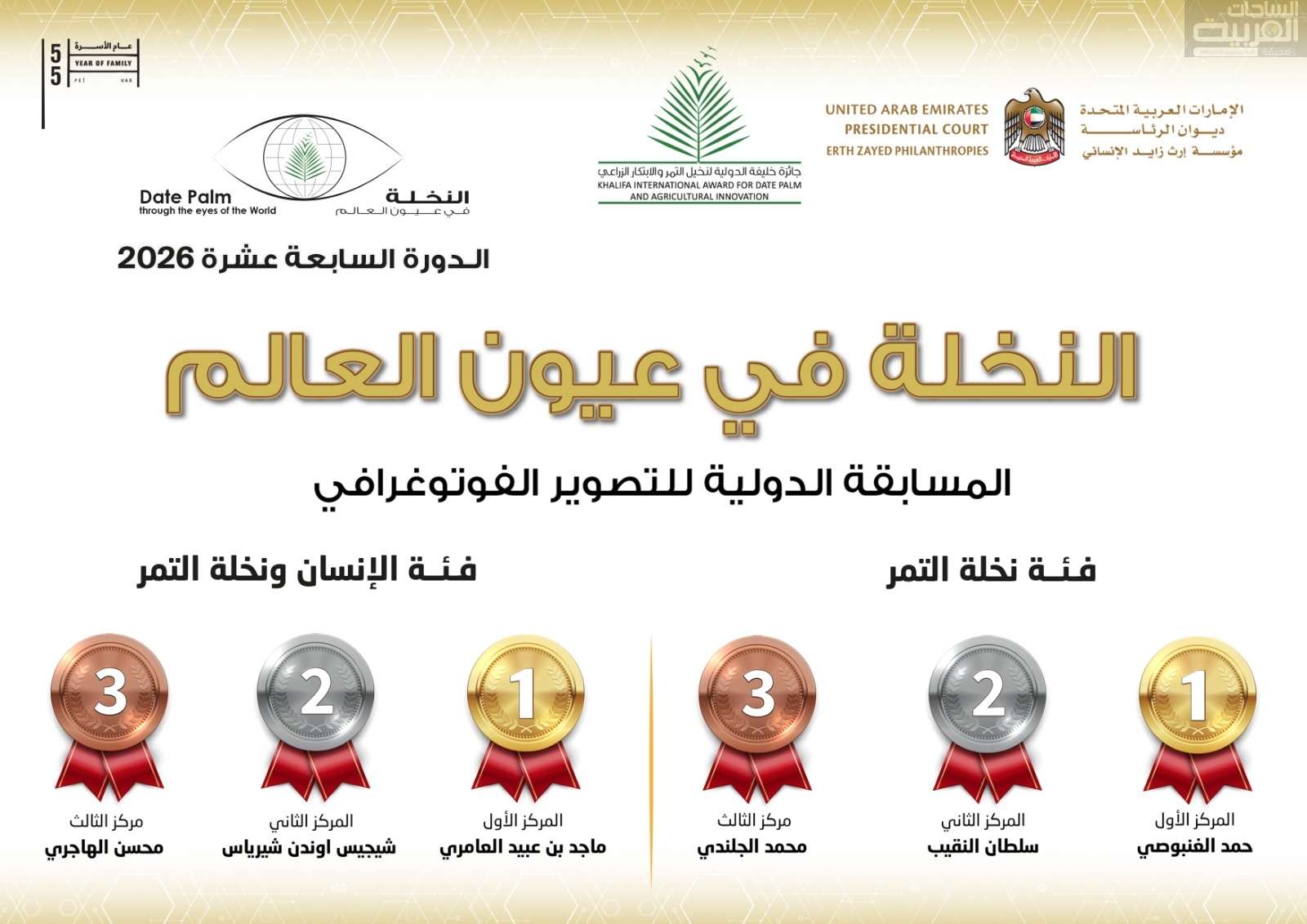 أعلنت الأمانة العامة لجائزة خليفة الدولية لنخيل التمر والابتكار الزراعي، التابعة لمؤسسة إرث زايد الإنساني، ديوان الرئاسة، عن أسماء الفائزين في مسابقة التصوير الدولية “النخلة في عيون العالم” بدورتها السابعة عشرة (2026)، التي تُنظَّم برعاية كريمة من معالي الشيخ نهيان مبارك آل نهيان، وزير التسامح والتعايش، رئيس مجلس أمناء الجائزة، في تجسيد لدور الصورة في توثيق العلاقة بين الإنسان والطبيعة وتعزيز القيم الإنسانية المشتركة. حيث جاءت النتائج على النحو التالي: