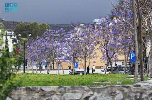 وتعكس المشاهد التي وثقتها وكالة الأنباء السعودية “واس” دورة متجددة من هذا الإزهار الموسمي، حيث تتدلّى أغصان “الجاكرندا” البنفسجية برفق فوق الأرصفة والممرات، في تناغم لافت مع المساحات الخضراء، بينما تضفي زخات المطر الخفيفة مزيدًا من البريق على بتلاتها، فتبدو كأنها لوحات طبيعية حيّة تعكس جمال الطبيعة في منطقة عسير.