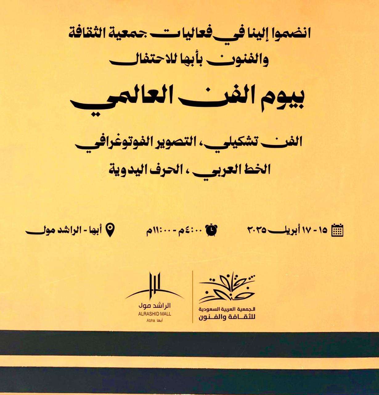 تستعد جمعية الثقافة والفنون في أبها بالإحتفاء اليوم العالمي للفن 2026 من خلال سلسلة من الفعاليات الفنية والثقافية التي تعكس تنوع المشهد الإبداعي في منطقة عسير، وذلك عبر معرض للفنون البصرية يُقام في مركز الراشد للفنون، بمشاركة نخبة من الفنانين والفنانات، في خطوة تُبرز الحراك التشكيلي المتنامي في المنطقة.