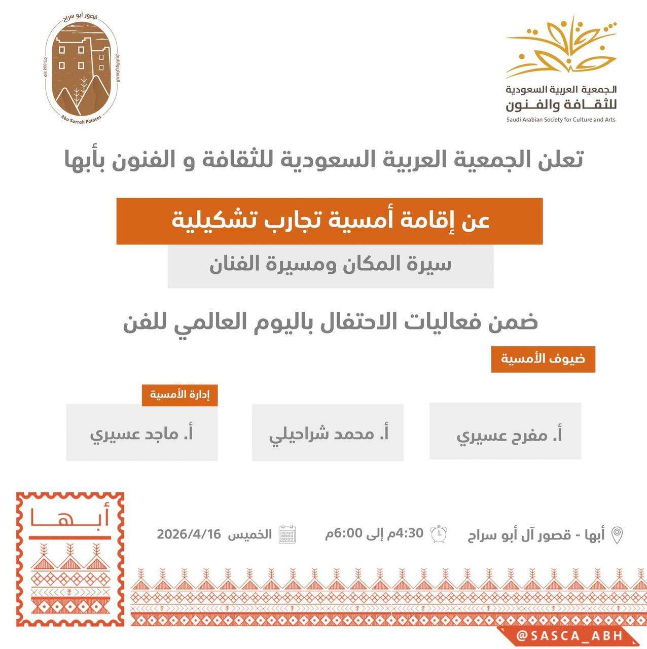 وتتضمن الفعاليات كذلك ندوة حوارية تُقام مساء غدٍ الخميس في قصور آل أبو سراح بعنوان تجارب تشكيلية مسيرة المكان والفنان، بمشاركة الفنان مفرح عسيري والفنان محمد شراحيلي، وإدارة الفنان ماجد عسيري، حيث تسلط الندوة الضوء على تجارب فنية ومسارات إبداعية متنوعة.