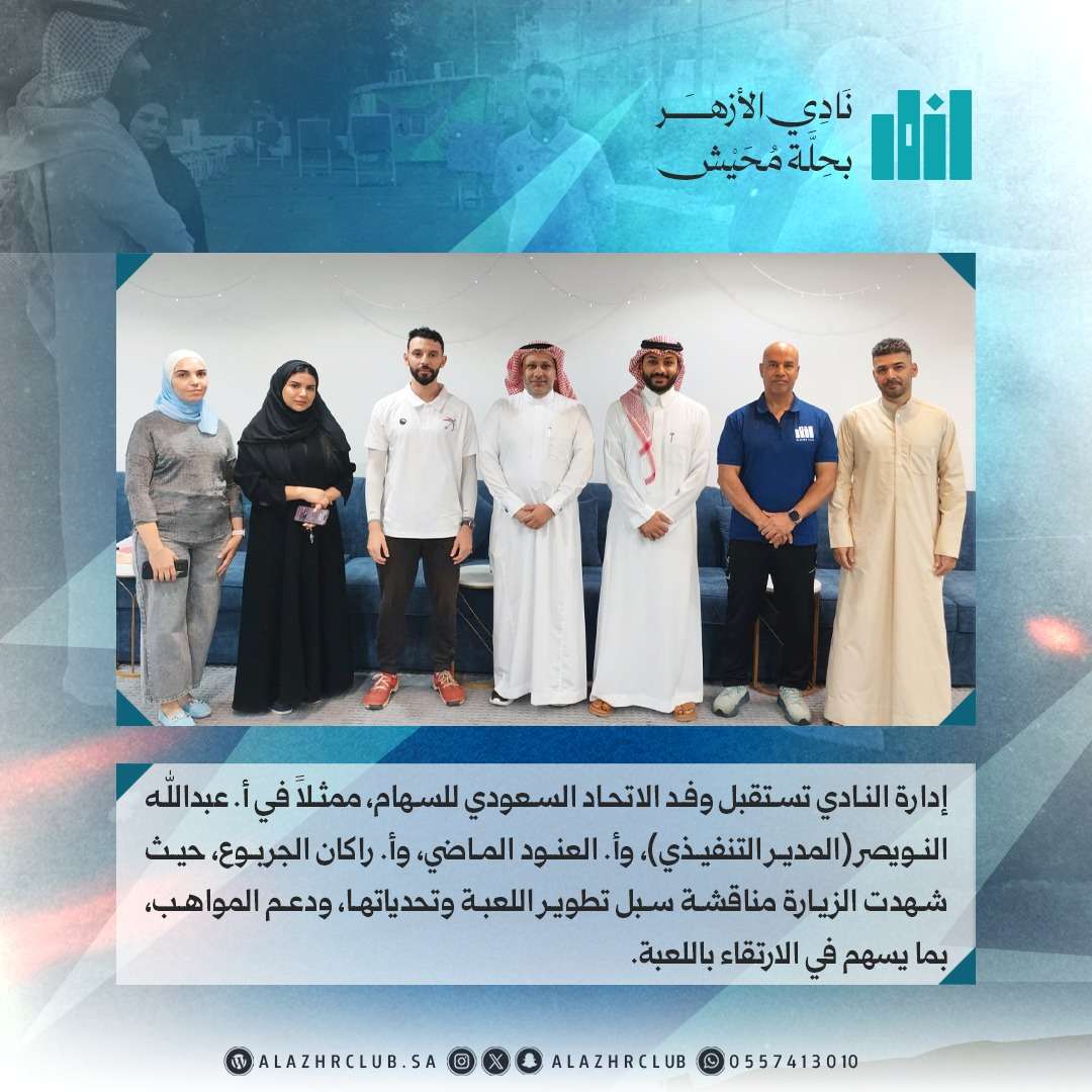 استقبلت إدارة نادي الأزهر بحلة محيش وفدًا من الاتحاد السعودي للسهام، ضم كلًا من الأستاذ عبدالله النويصر المدير التنفيذي للاتحاد، والأستاذة العنود الماضي أخصائي أول إعلام واتصال، والأستاذ راكان الجربوع أخصائي الأندية واللاعبين، وذلك في زيارة تهدف إلى تعزيز التعاون المشترك وتطوير لعبة السهام بالنادي.
