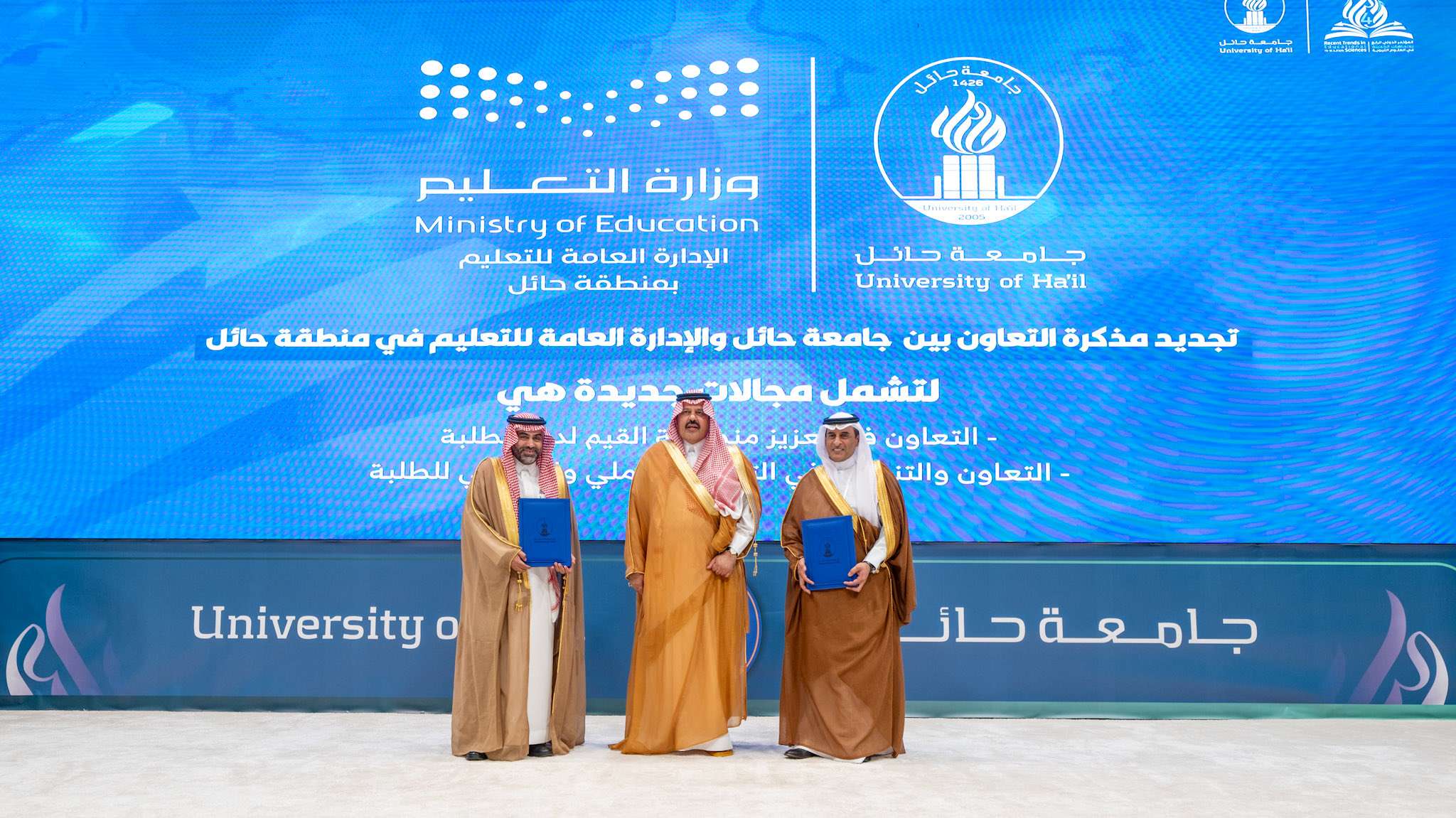 وشهد الحفل إلقاء قصيدة شعرية بهذه المناسبة، كما شهد سمو أمير المنطقة مراسم تجديد مذكرة التعاون بين جامعة حائل والإدارة العامة للتعليم بالمنطقة؛ بهدف تعزيز التعاون المشترك وتطوير القطاع التعليمي.