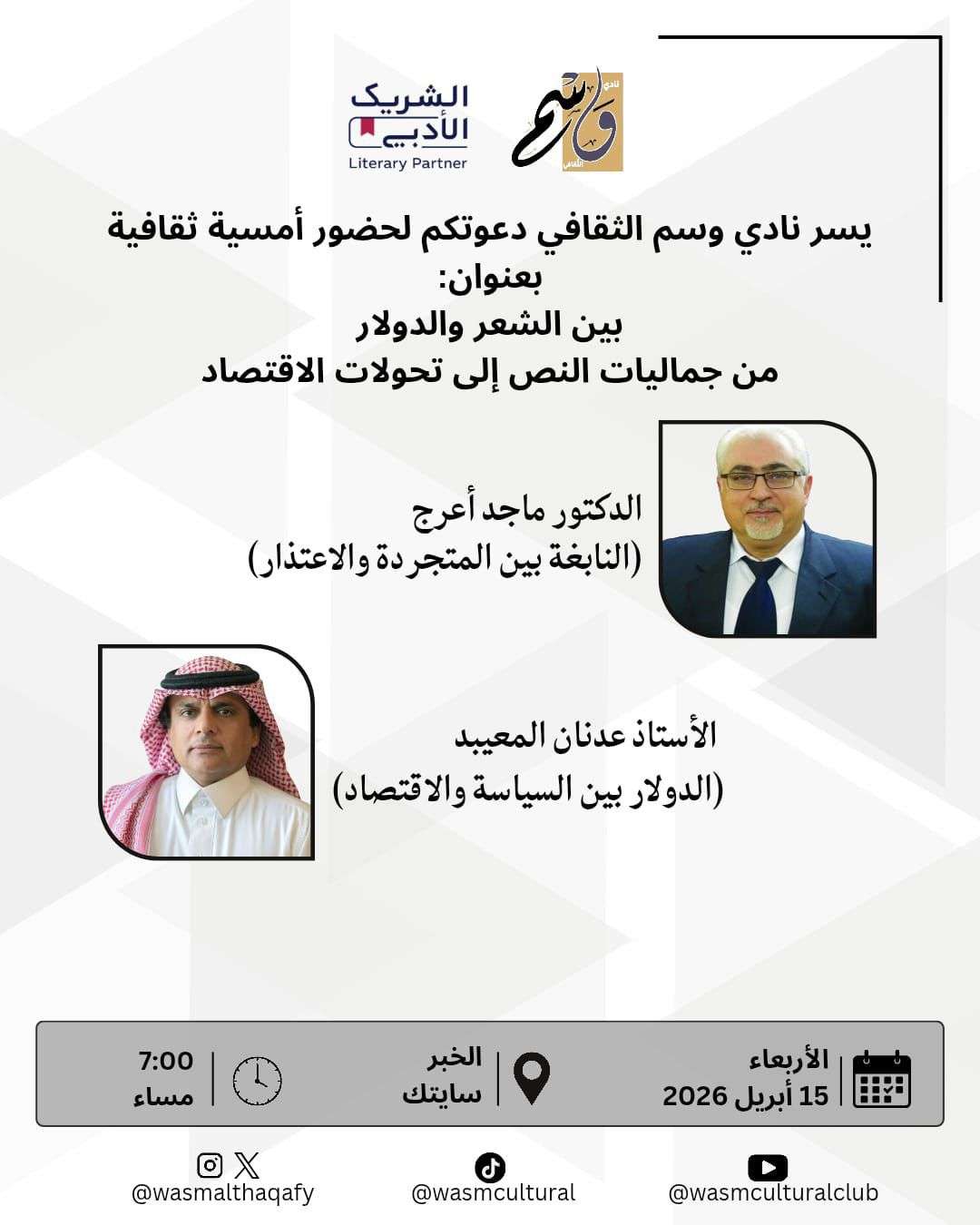 ينظم نادي وسم الثقافي مساء اليوم الأربعاء 27 شوال 1447هـ، أمسية ثقافية بعنوان “بين الشعر والدولار”، وذلك في مركز سايتك بمحافظة الخبر، ضمن برامجه الهادفة إلى تنويع الطرح الثقافي وإثراء المشهد المعرفي.