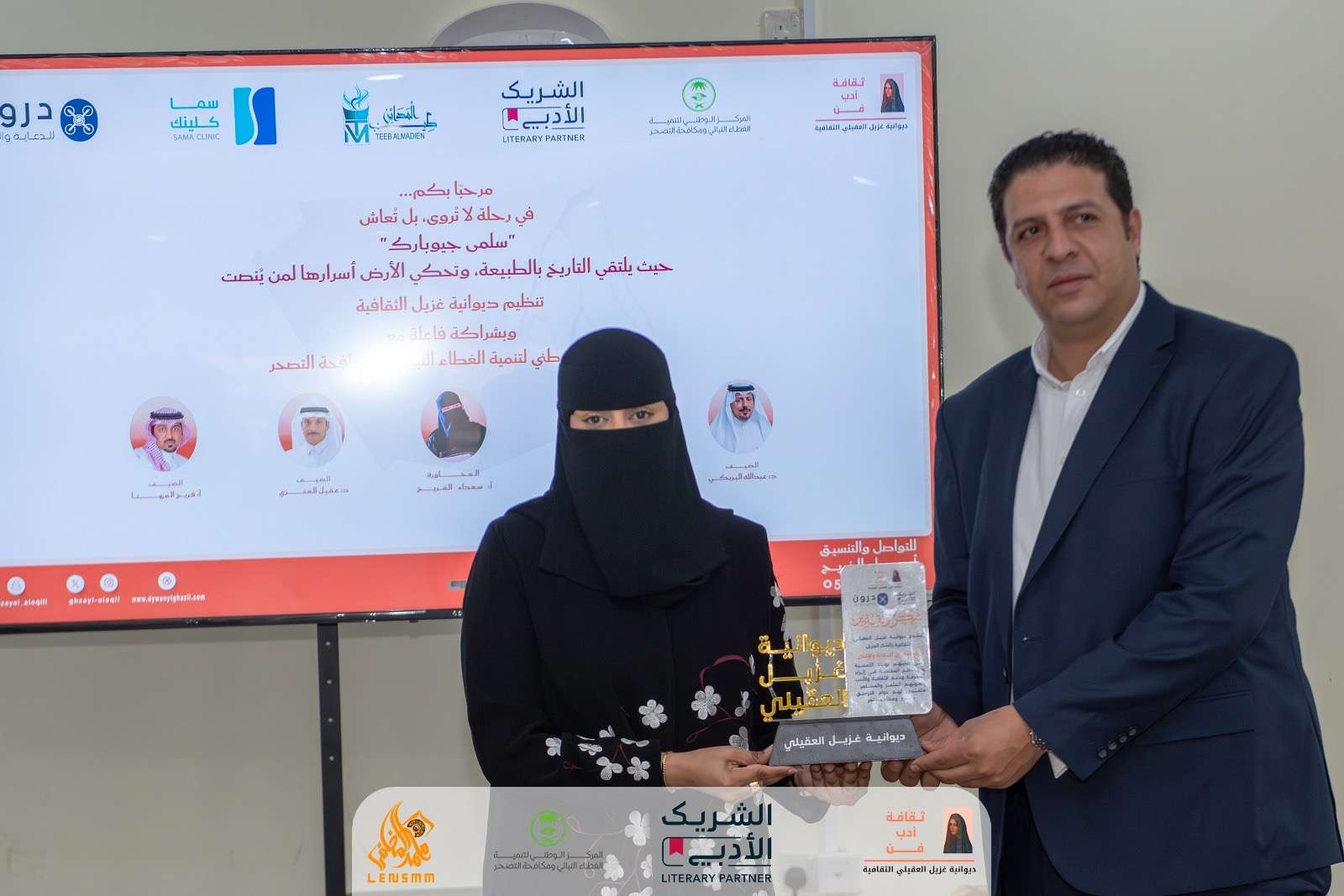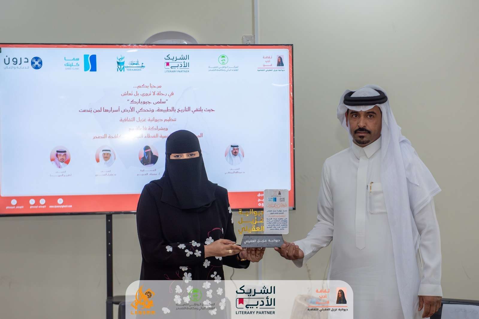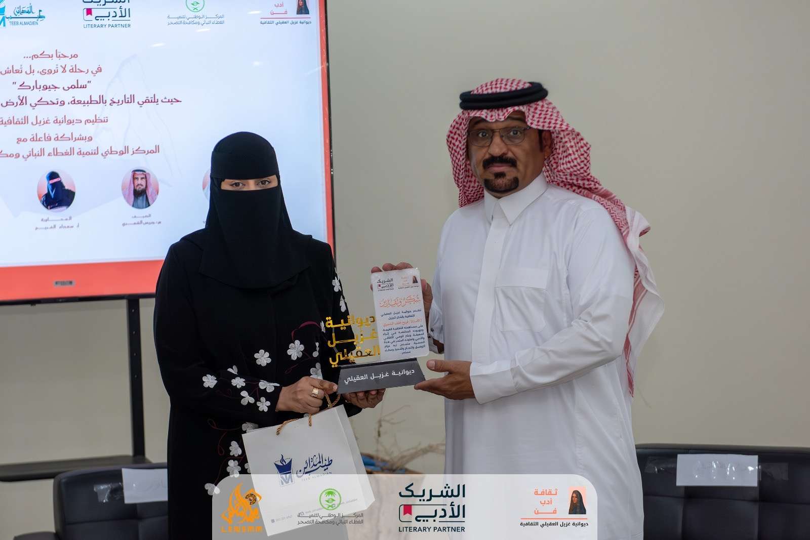 نظّمت ديوانية غزيل العقيلي الثقافية، مساء اليوم السبت 25 أبريل 2026م ، لقاءً ثقافيًا بعنوان “سلمى جيوبارك.. حكاية مكان وتجربة تعيشها”، وذلك بالتعاون مع المركز الوطني لتنمية الغطاء النباتي ومكافحة التصحر، بمقر المركز في منطقة حائل، وسط حضور نوعي من المهتمين بالشأن الثقافي والبيئي والسياحي،
