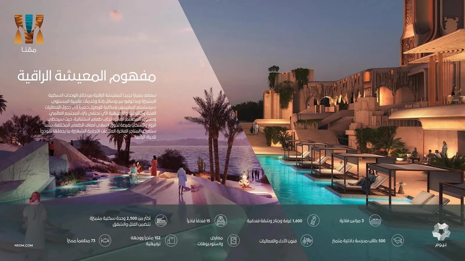 كما سيضم “مقنا” 15 فندقًا فاخرًا، تشتمل على أكثر من 1600 غرفة وجناح وشقة فندقية، وتستوعب أكثر من 300,000 نزيل فندقي سنويًا، بالإضافة إلى أكثر من 2500 وحدة سكنية راقية. وتتميز كل وجهة من وجهات «مقنا» بخصائص وتجارب مختلفة عن الأخرى من حيث الخدمات والأنشطة والتجارب التي ستقدمها للسكان والضيوف، في حين تتكامل هذه الوجهات بسلاسة لتشكل هوية واحدة تعمل على تحقيق الالتزام برؤية نيوم من خلال الحفاظ على التنوع البيولوجي، والطبيعة المحيطة، وإعادة تأهيلها.