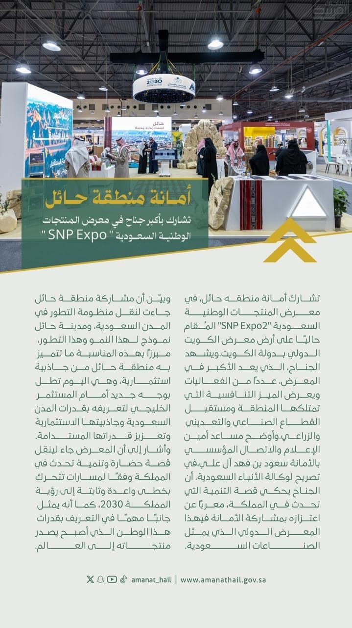 وتستعرض الأمانة خلال المعرض مقومات حائل الاقتصادية والصناعية، حيث تمتلك المنطقة أكثر من 40 منشأة صناعية متنوعة، إلى جانب تحقيق زيادة بنسبة 30% في حجم الاستثمار الصناعي خلال السنوات الأخيرة مما يعكس جاذبية المنطقة كمركز صناعي نامٍ في المملكة، كما تحتل المرتبة التاسعة بعدد يناهز 746،406 نسمة، وتسلط الأمانة الضوء على الثروات الطبيعية الفريدة التي تزخر بها المنطقة بما فيها السيليكا النقية بنسبة تصل إلى 98% في جبال أجا والتي تُعدّ من أهم الموارد الصناعية، بالإضافة إلى احتياطيات اليورانيوم في منطقة الشويمس التابعة لمنطقة حائل، مما يعزز مكانة المنطقة كوجهة استراتيجية للصناعات المتقدمة والطاقة، كذلك تُعد حائل ضمن المدن المستضيفة لكأس العالم عام2034، وكما تحتضن أراضيها رالي حائل الدولي والذي يُعد أحد اهم الفعاليات الرياضية في العالم.