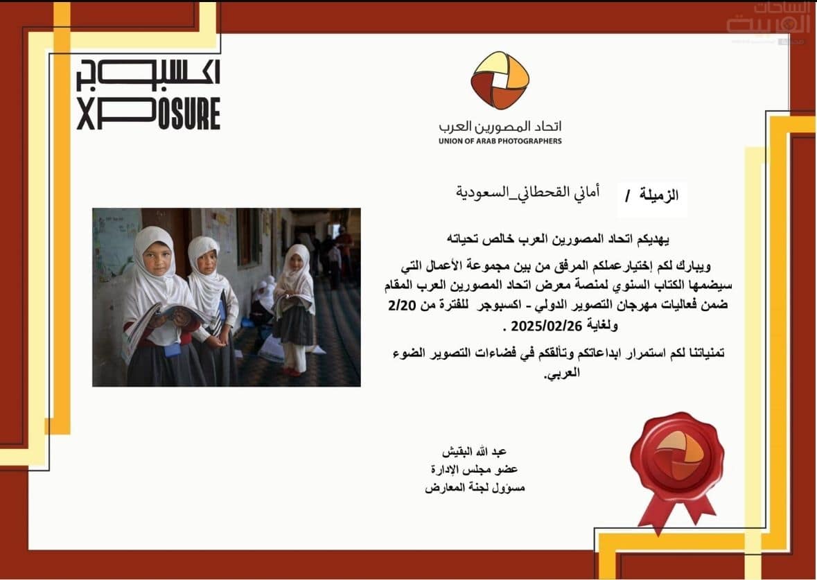 فازت عضو جمعية إعلاميون المصورة الفوتغرافية السعودية أماني القحطاني، بأن تكون صورتها “تحدي الجهل” ضمن مجموعة الأعمال التي سيضمها الكتاب السنوي لمنصة معرض اتحاد المصورين العرب، المقدم إلى مهرجان التصوير الدولي – “اكسبوجر” الذي تم خلال شهر فبراير ٢٠٢٥.